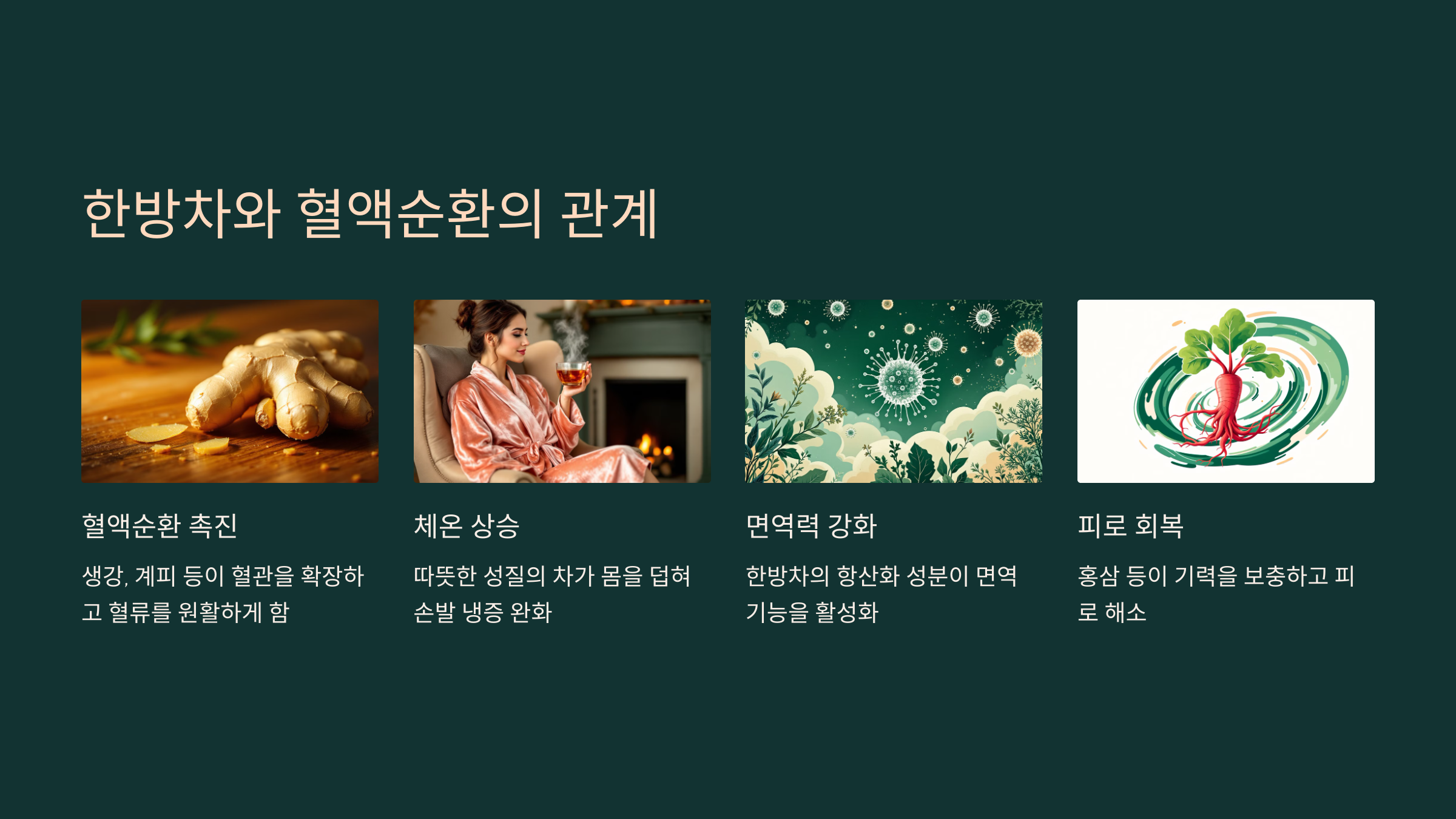 이처럼 한방차는 혈액순환을 개선하는 데 유용한 효과를 가지고 있어요. 이제 어떤 재료들이 혈류 개선에 도움을 주는지 살펴볼까요? 🌱