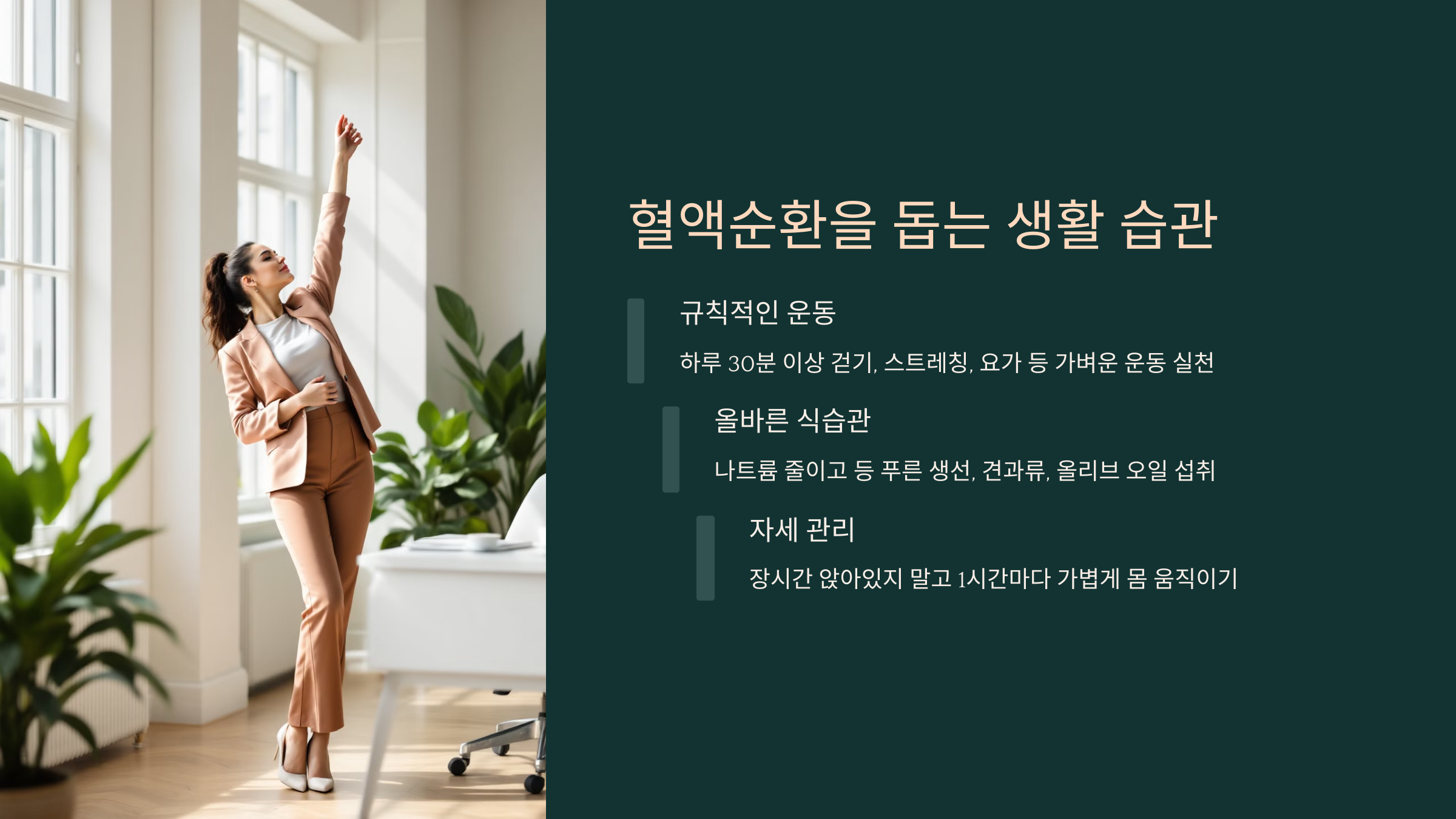 작은 습관의 변화가 큰 건강 변화를 만들어내요! 혈액순환을 위한 습관을 꾸준히 실천해 보세요. 💪