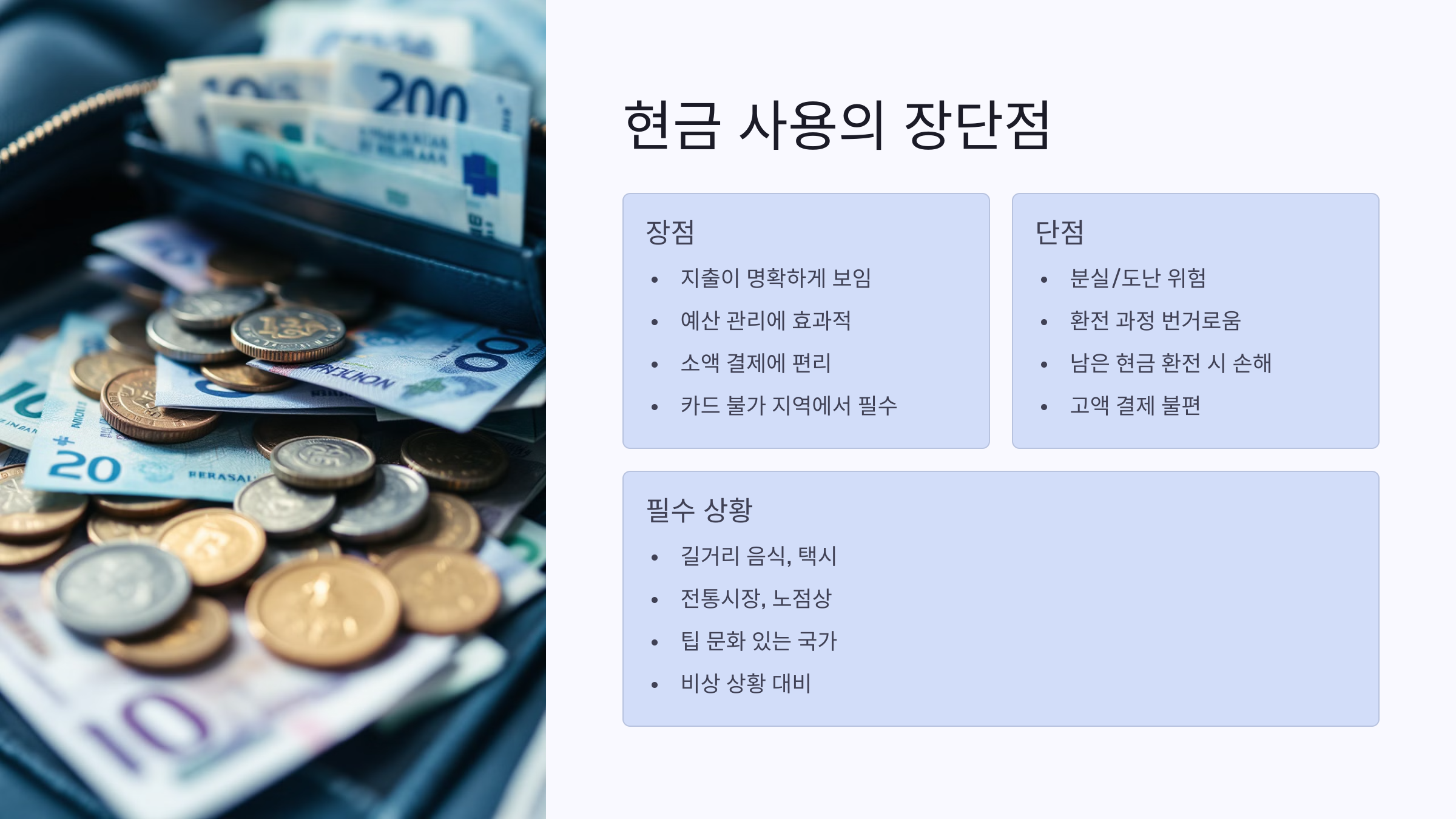 반면 현금은 사용한 만큼 눈에 보여서 계획적인 지출이 가능하고, 카드 사용이 어려운 소규모 상점이나 교통 수단에서도 유용해요. 하지만 너무 많이 들고 다니면 분실이나 도난 위험이 커지고, 남은 금액 환전 시 손해를 볼 수도 있어요.