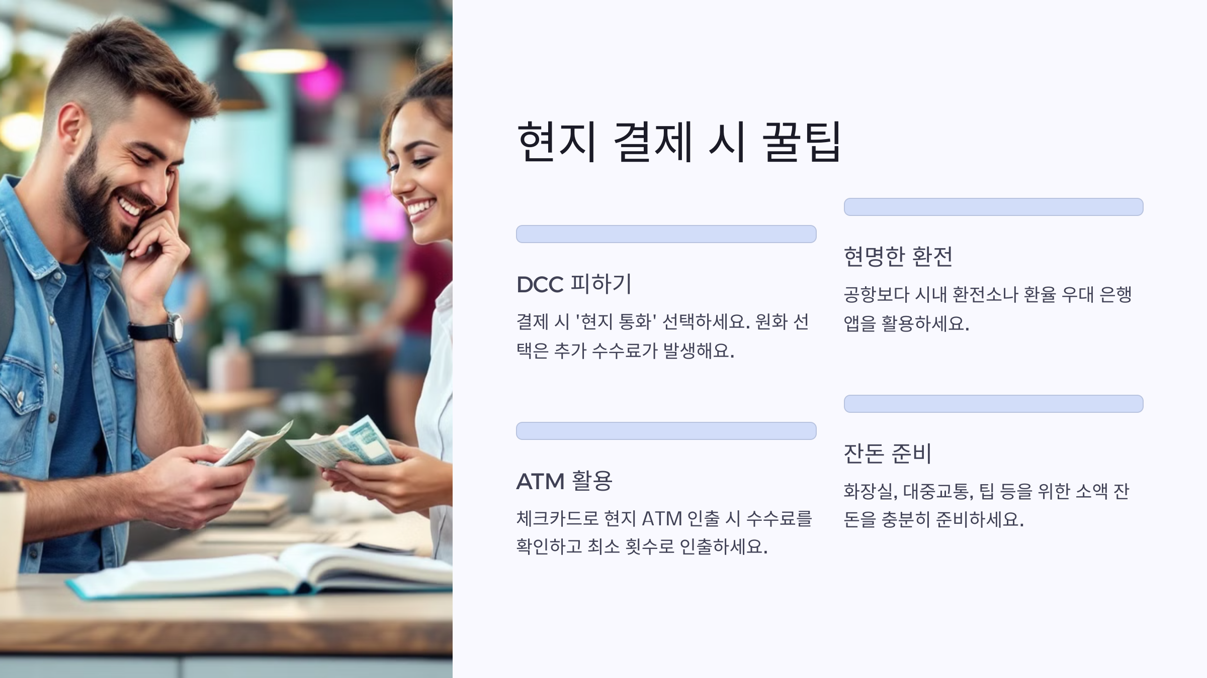 먼저 카드 결제를 할 때 DCC(Dynamic Currency Conversion) 주의가 필요해요. 결제 시 원화로 할지 현지 통화로 할지 묻는 경우, 반드시 현지 통화를 선택하는 게 좋아요. 원화를 선택하면 별도의 환전 수수료가 덧붙고, 환율도 불리하게 적용되는 경우가 많아요.