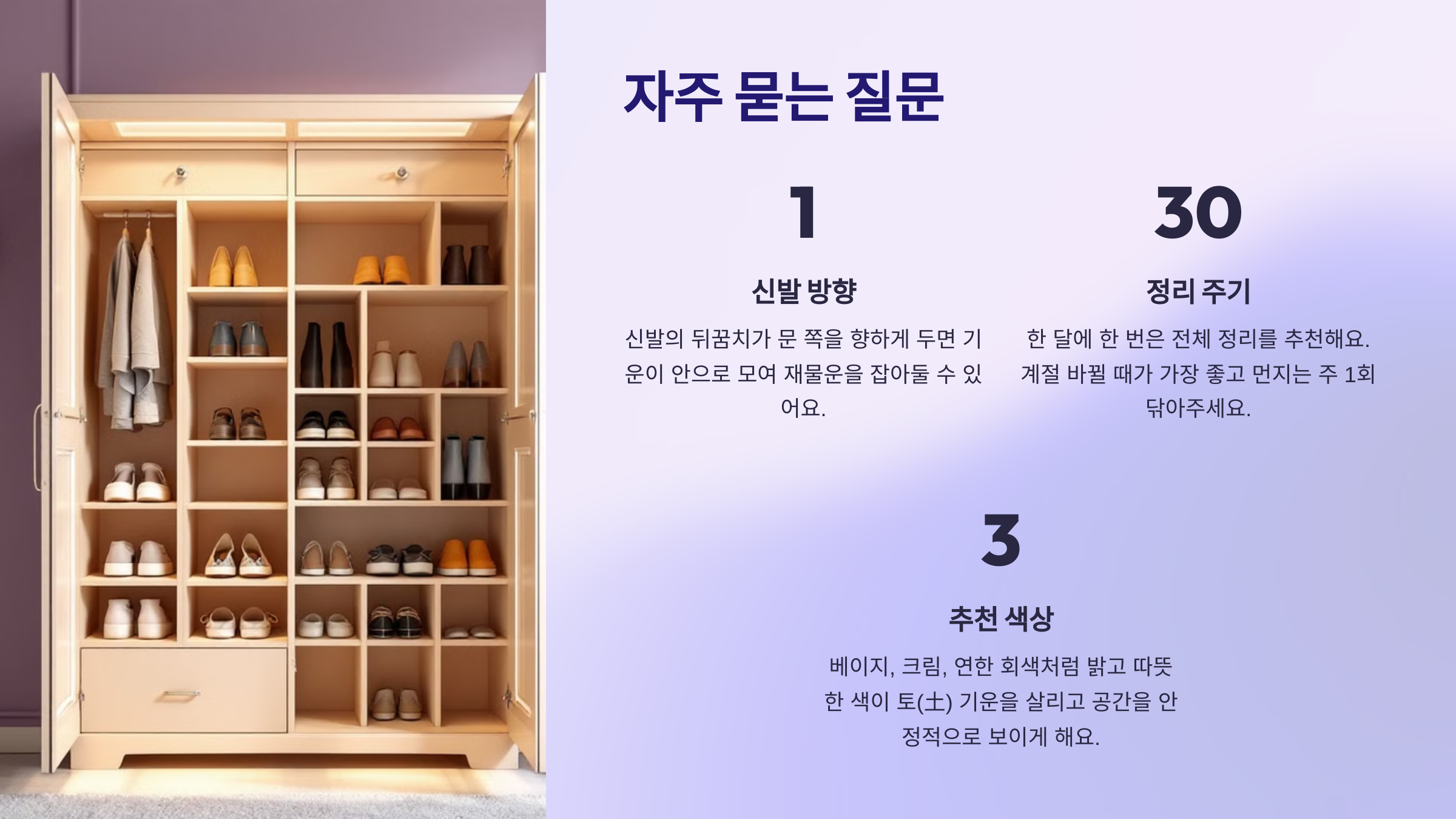A1. 풍수에서는 신발장이 기운이 들어오는 첫 관문이라 보고 있어요. 정돈된 신발장은 좋은 기운이 머무를 수 있도록 도와줘서 재물운에도 긍정적인 영향을 준다고 알려져 있답니다 💰