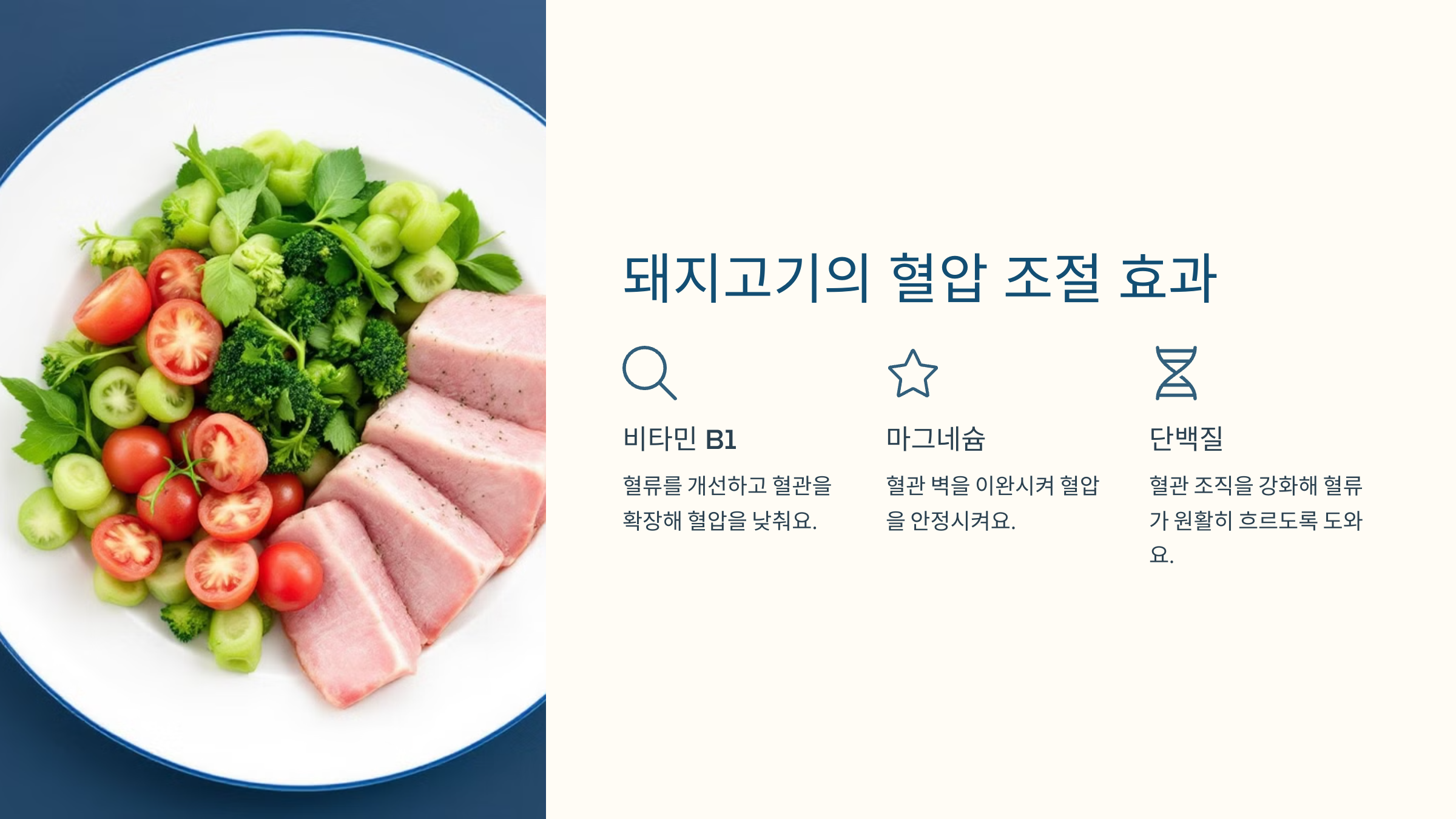 돼지고기는 단백질과 비타민 B군, 마그네슘이 풍부해 혈압을 조절하는 데 도움을 줘요. 특히 비타민 B1(티아민)은 혈관을 확장시켜 혈류를 원활하게 하고, 마그네슘은 혈관을 이완시켜 혈압을 안정화해요.