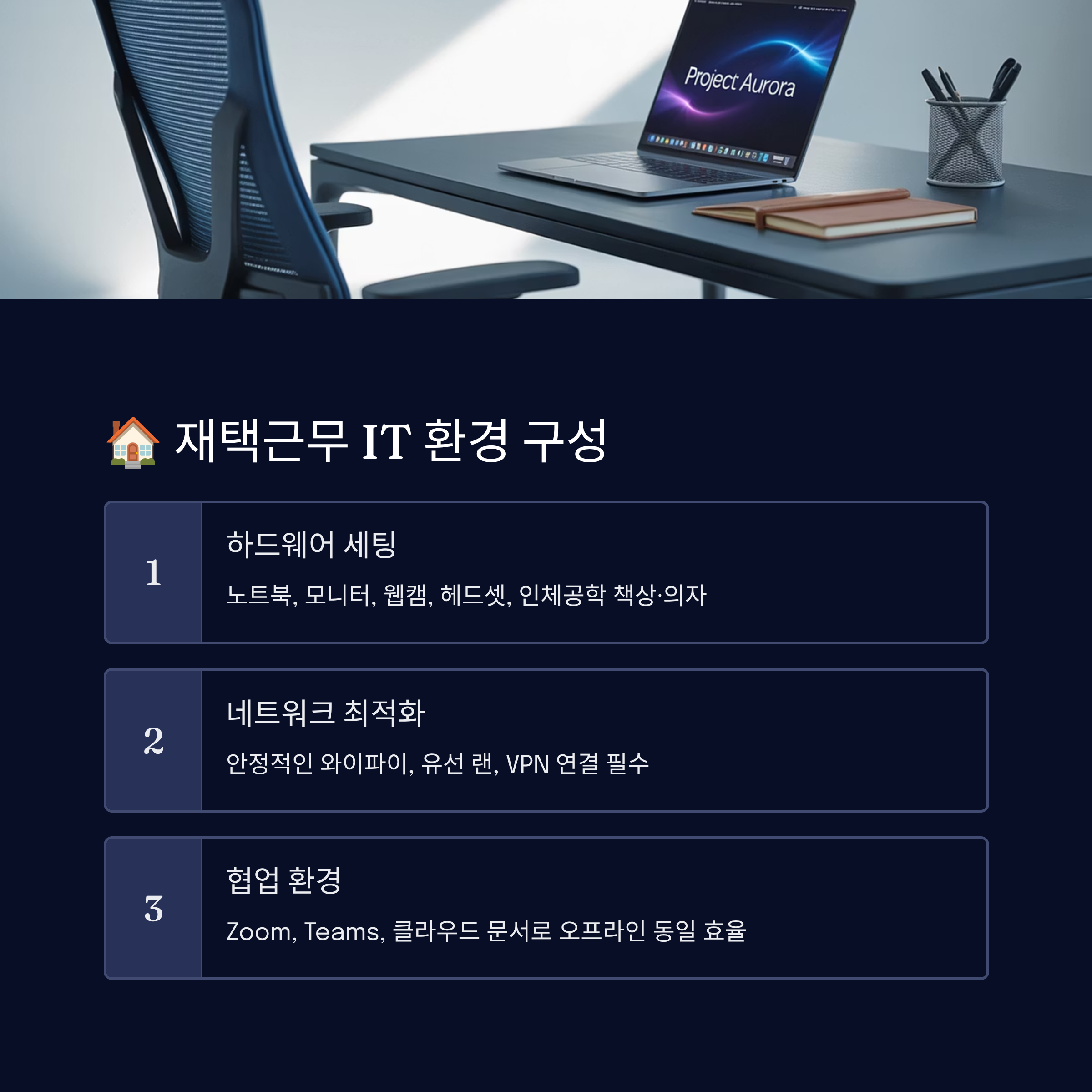 A3. 노트북, 모니터, 웹캠, 헤드셋, 인체공학 책상·의자, 안정적인 인터넷 연결 등이 필수예요. VPN과 클라우드 연동으로 사무실 환경과 동일하게 구성할 수 있어요.