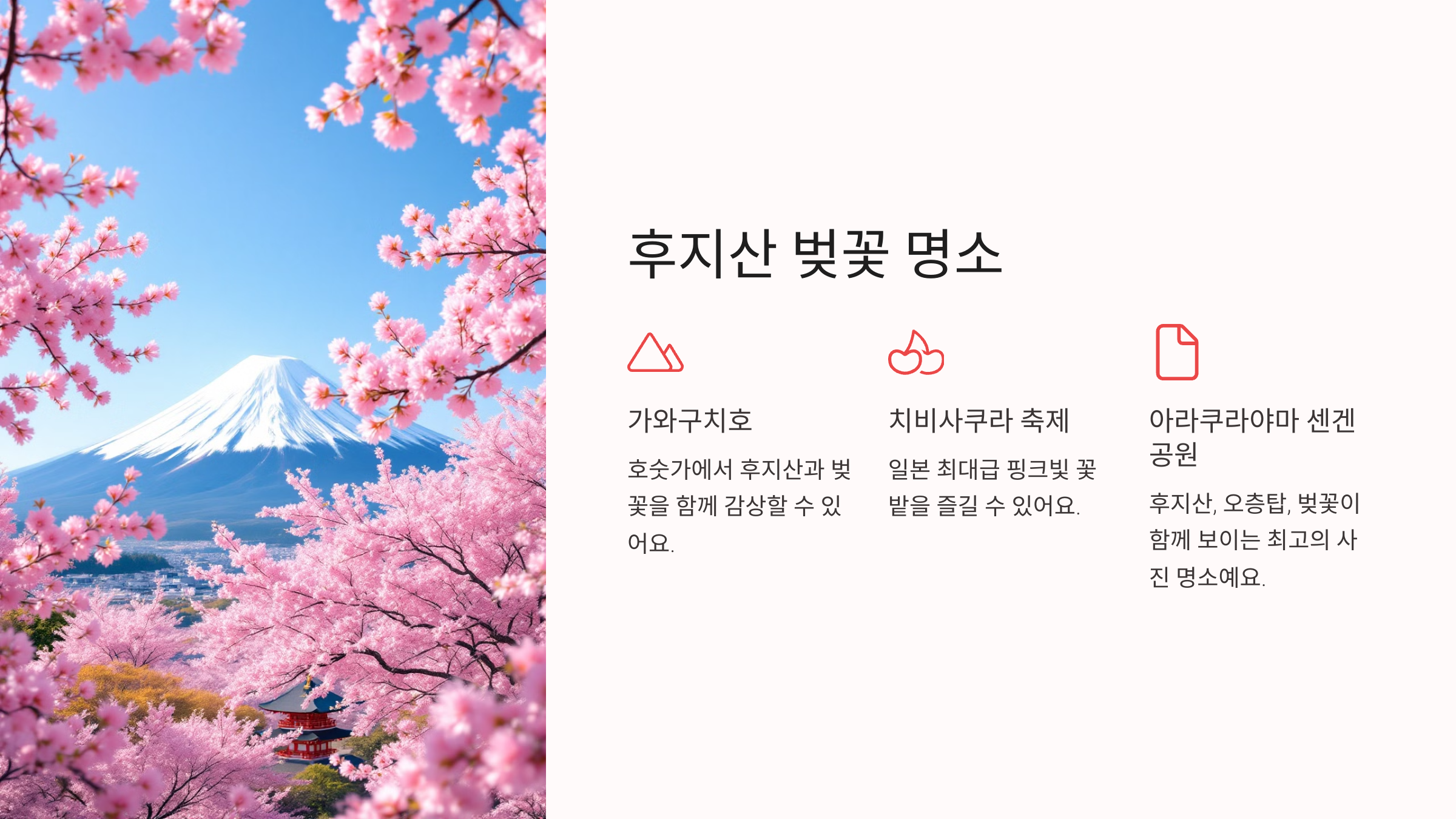 특히 가와구치호, 치비사쿠라 축제, 신겐 공원은 후지산과 함께 벚꽃을 즐길 수 있는 대표적인 명소예요. 후지산과 벚꽃을 한 프레임에 담는 인생샷 명소로도 유명하죠! 📸