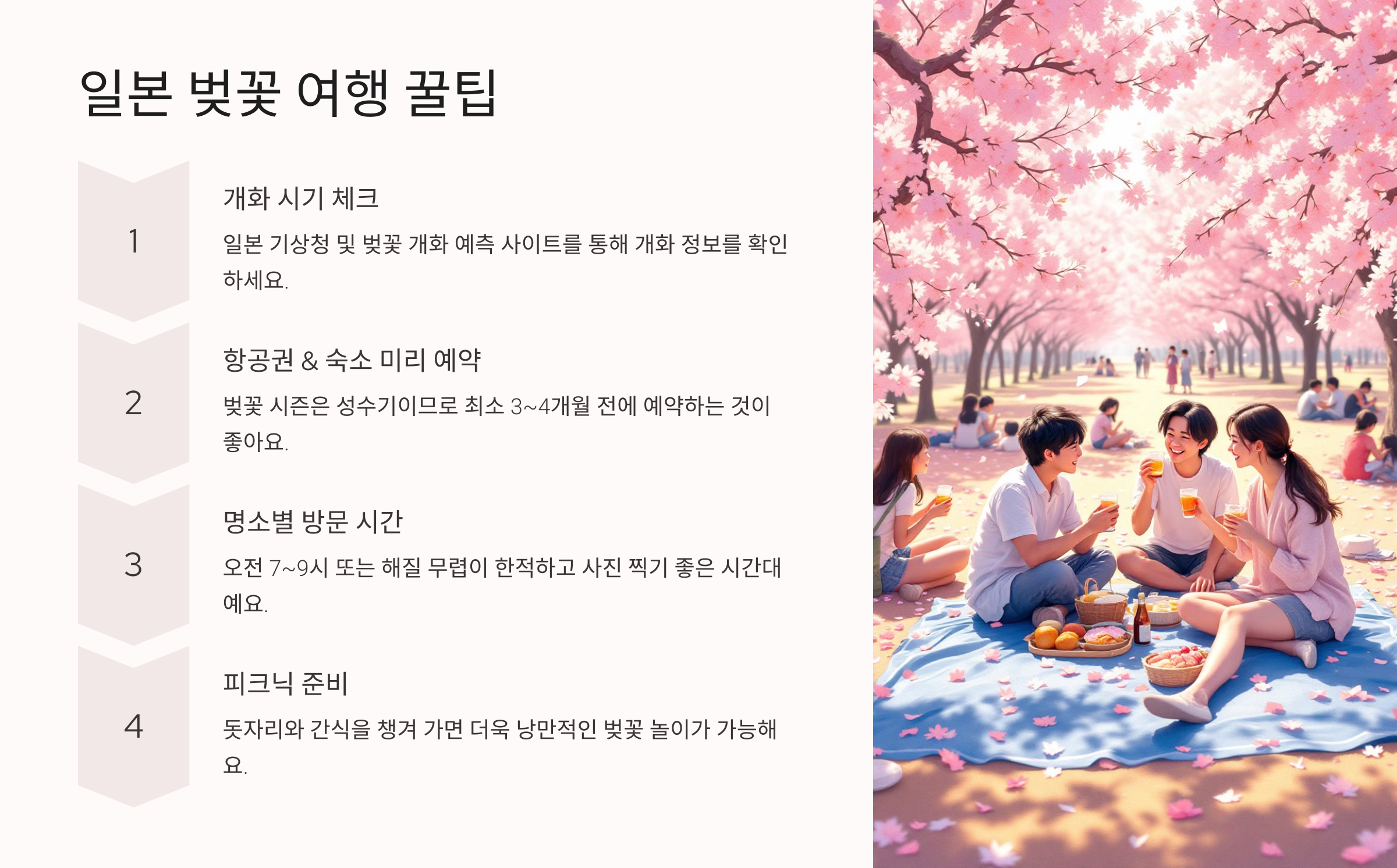 그럼, 일본 벚꽃 여행을 더욱 스마트하게 즐길 수 있는 필수 꿀팁을 정리해볼게요! 💡