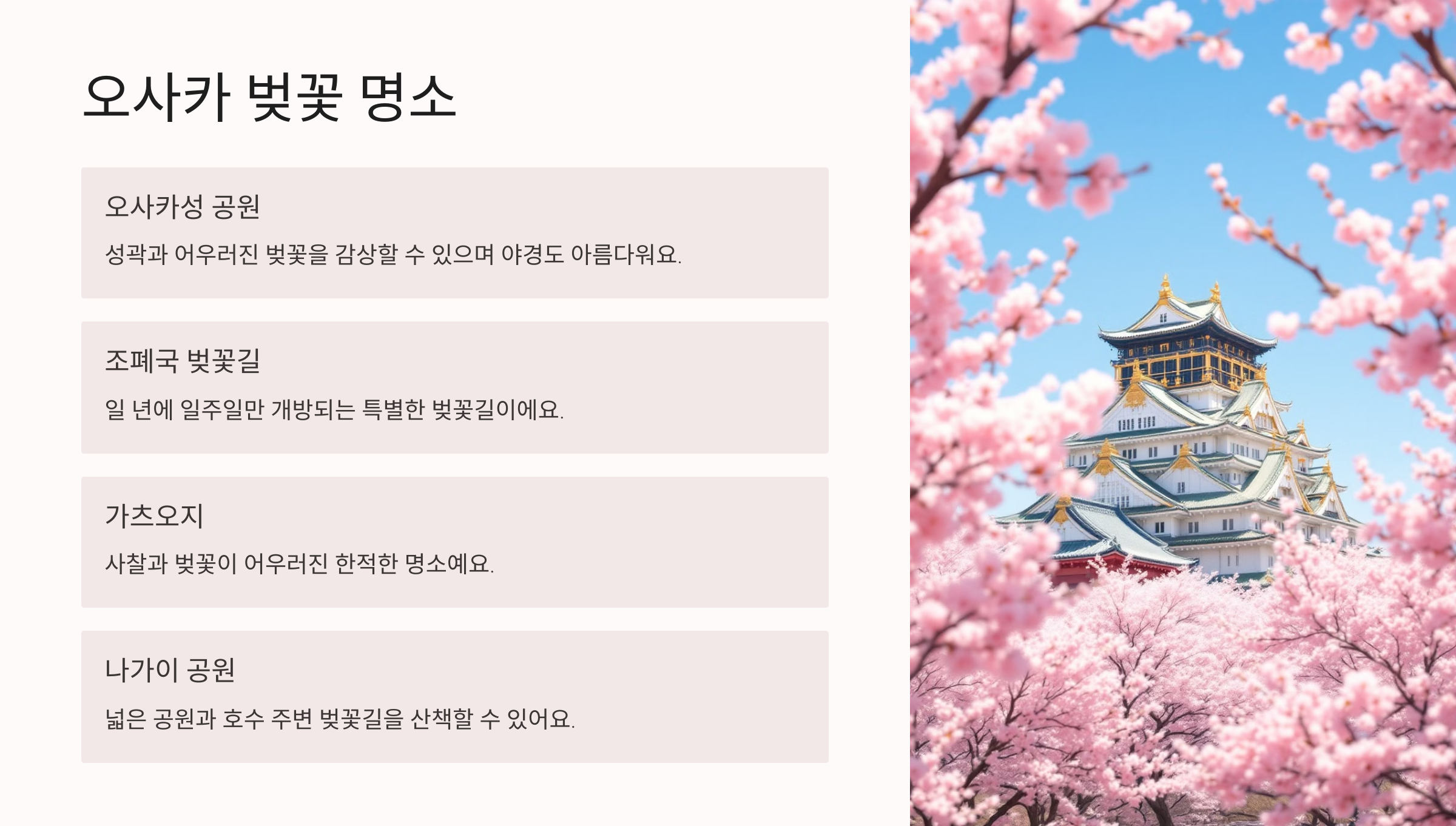 | 오사카성 공원 | 성곽과 어우러진 벚꽃, 야경 명소 | 3월 말 ~ 4월 초 |