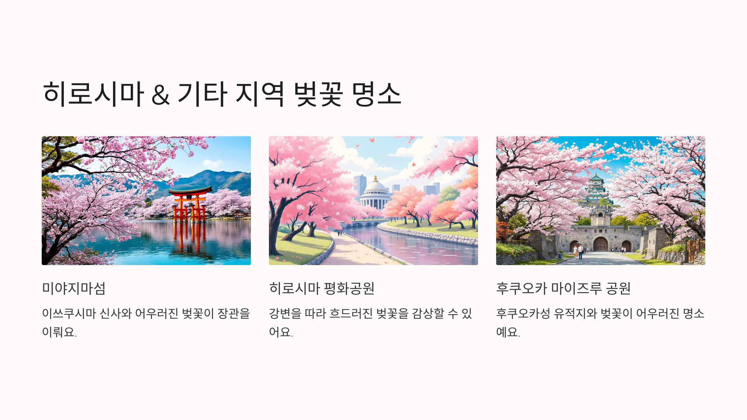 히로시마와 일본의 기타 지역에도 숨겨진 벚꽃 명소가 많아요! 🌸 유서 깊은 성(城) 주변, 강변, 사찰 등 다양한 장소에서 벚꽃을 감상할 수 있답니다. 특히, 평화공원과 미야지마섬은 일본 벚꽃 여행에서 빼놓을 수 없는 곳이에요. 🏯