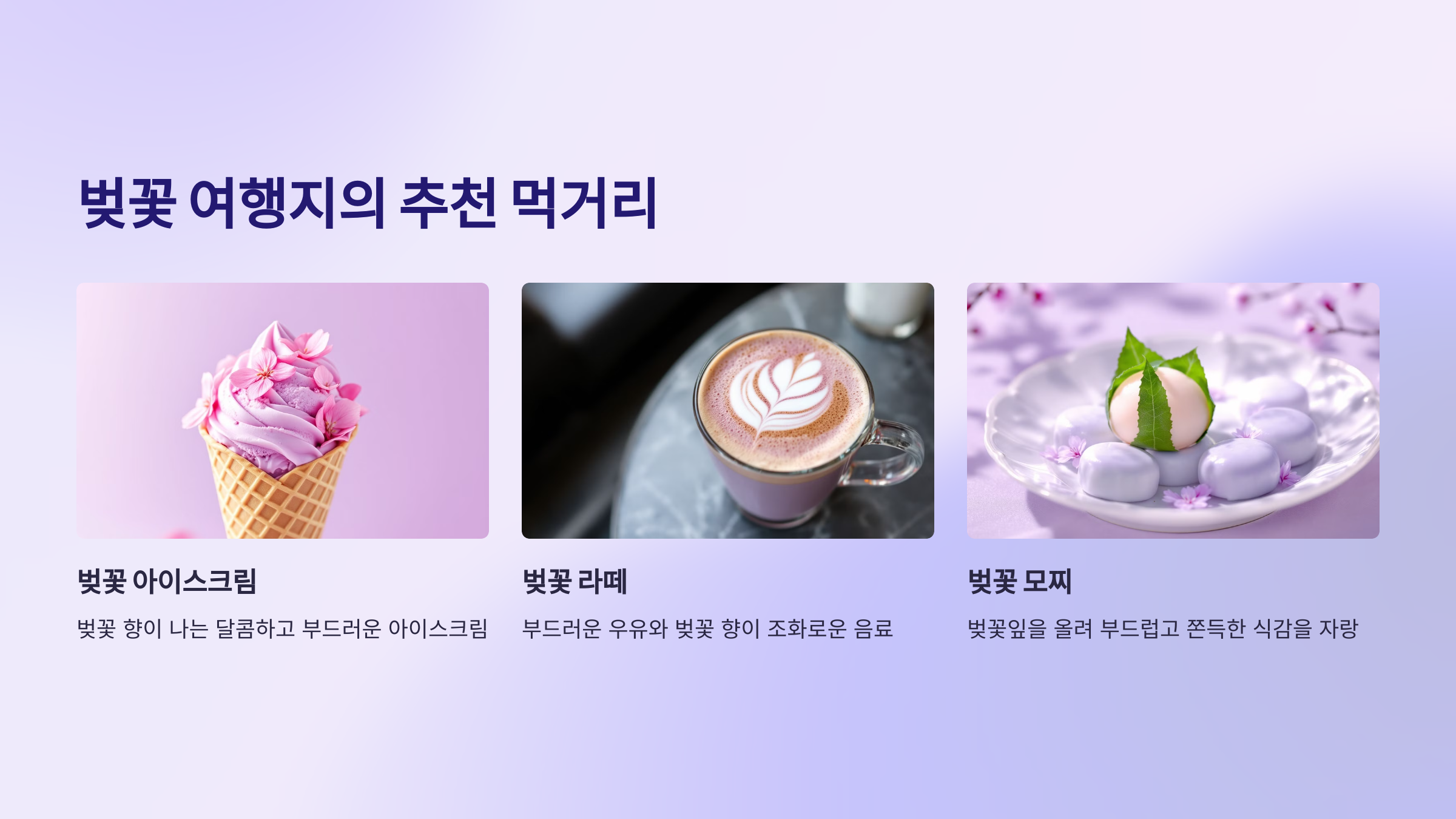 | 벚꽃 아이스크림 | 벚꽃 향이 나는 달콤하고 부드러운 아이스크림 |
