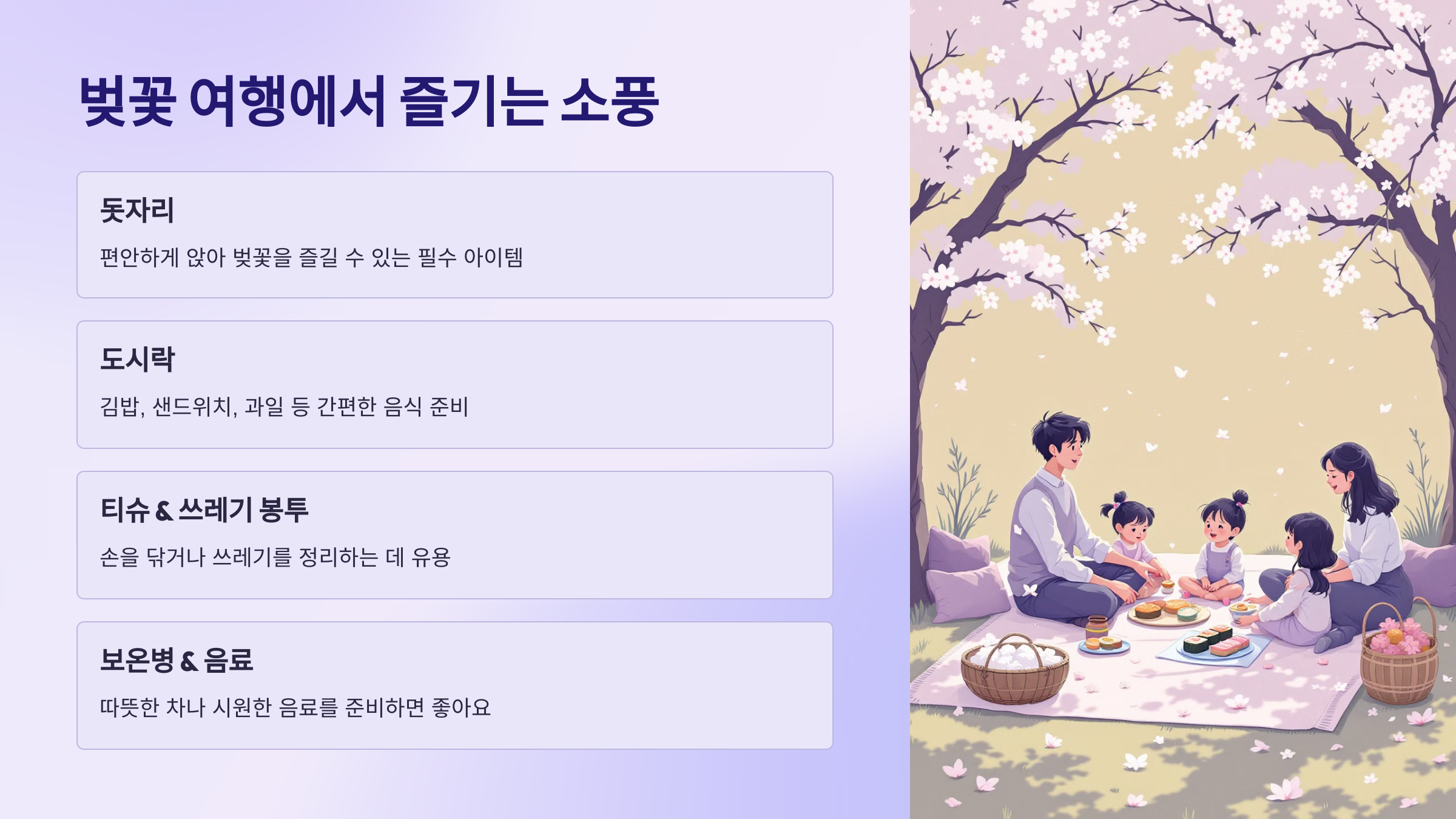 | 돗자리 | 편안하게 앉아 벚꽃을 즐길 수 있는 필수 아이템 |