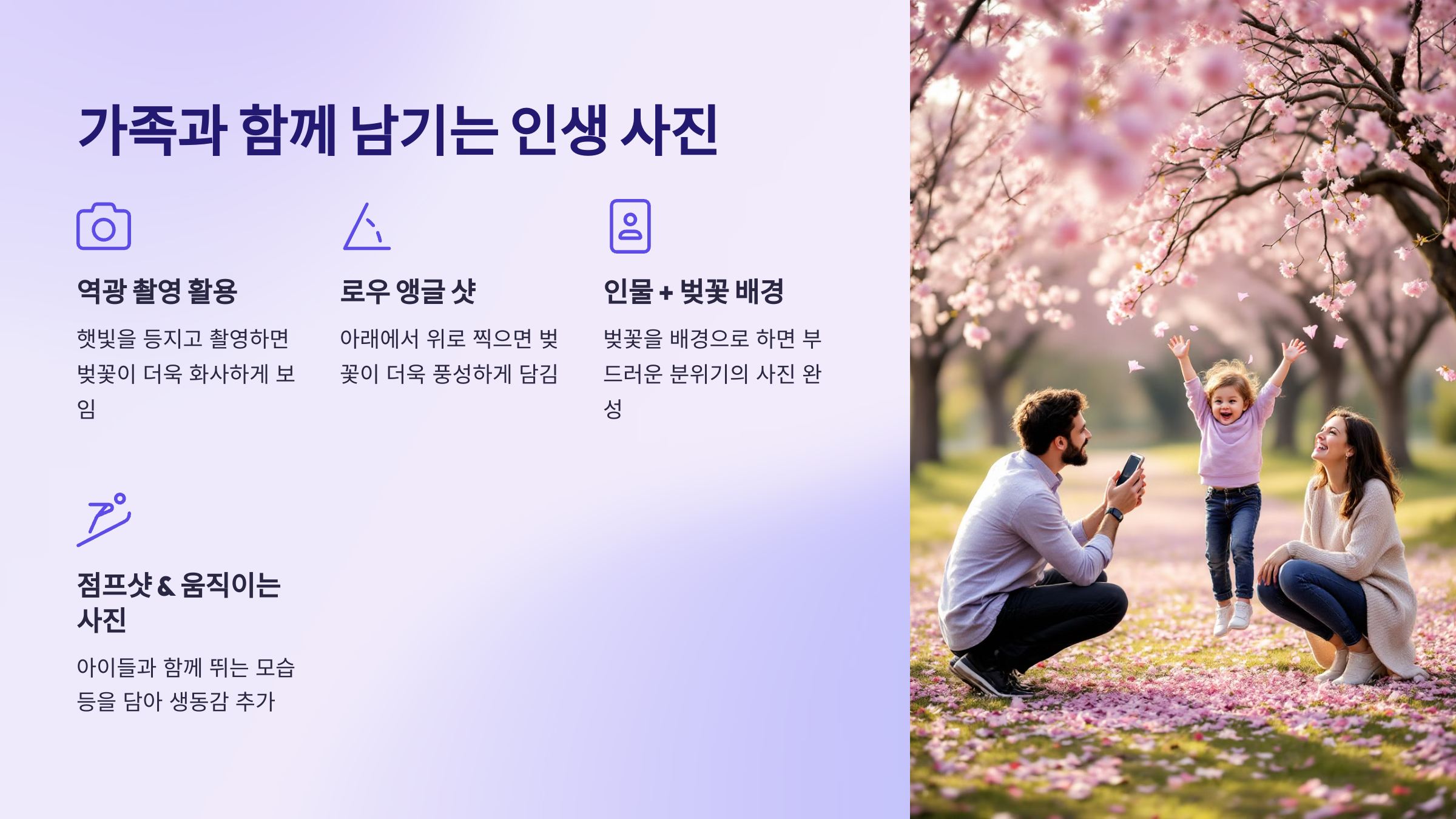 이렇게 미리 준비해 가면 벚꽃 아래에서 더 즐거운 시간을 보낼 수 있어요. 그럼 이번엔 벚꽃 여행에서 가족과 함께 예쁜 사진을 남기는 방법을 알아볼까요? 📸
