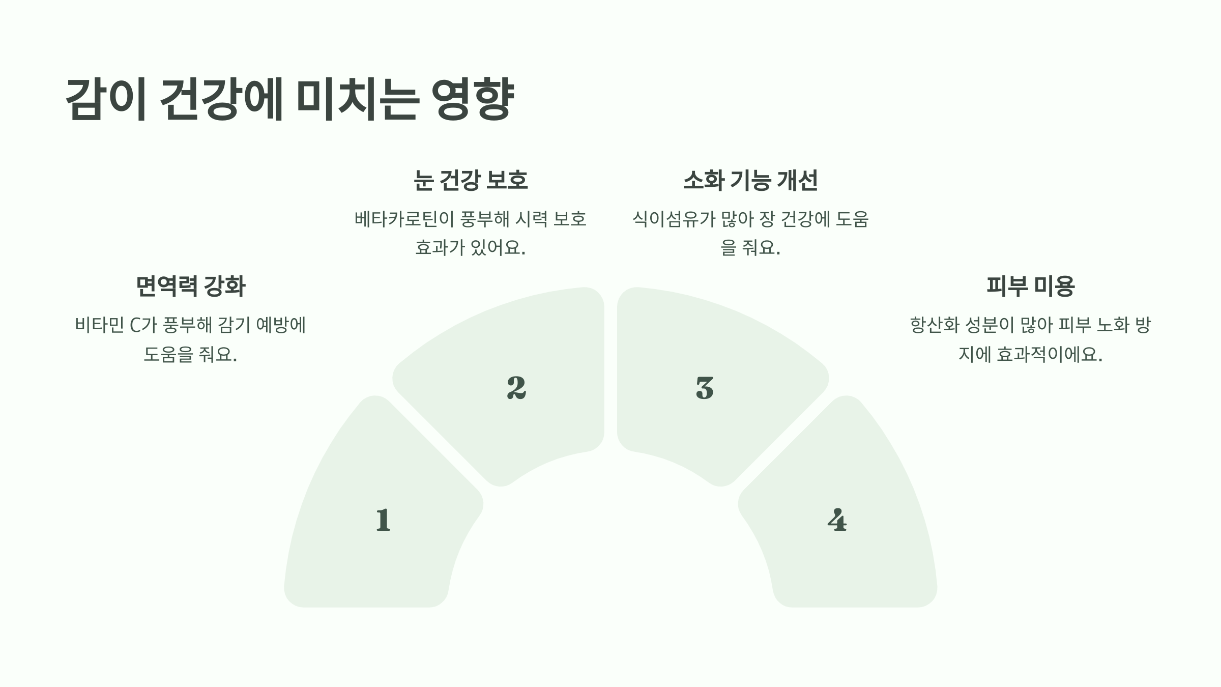 감 하나로 이렇게 다양한 건강 효과를 얻을 수 있다니! 매일 한 개씩 챙겨 먹어야겠어요. 🍊