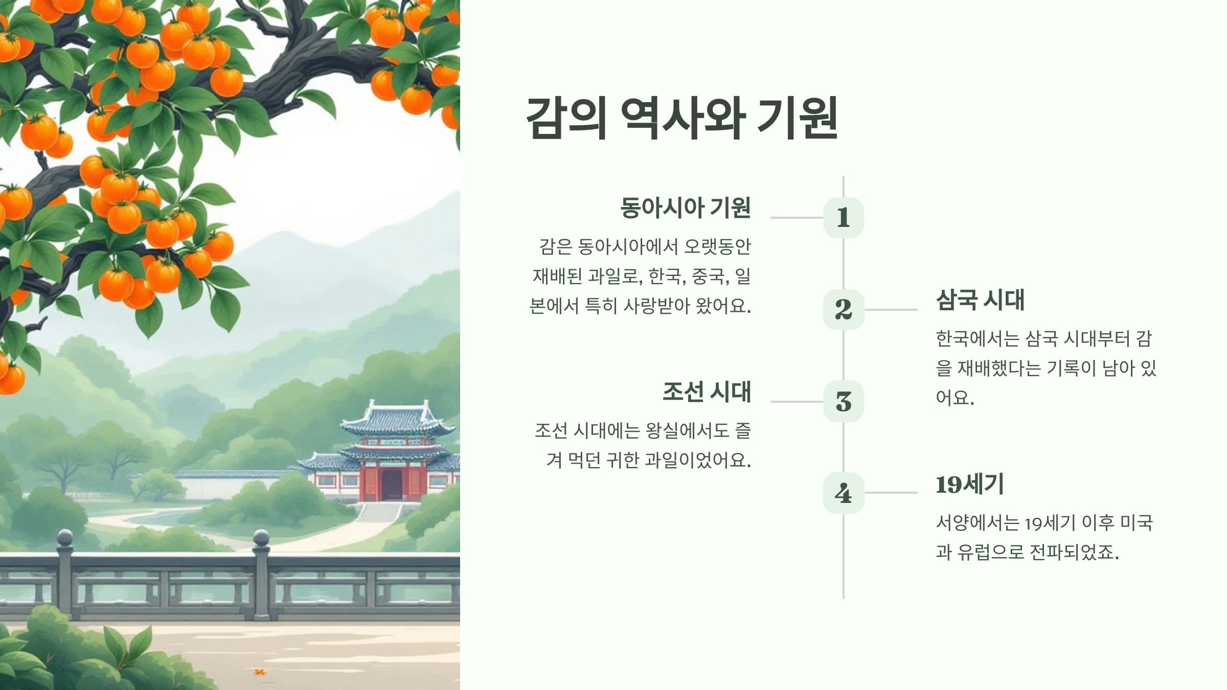 감은 동아시아에서 오랫동안 재배된 과일로, 한국, 중국, 일본에서 특히 사랑받아 왔어요. 한국에서는 삼국 시대부터 감을 재배했다는 기록이 남아 있으며, 조선 시대에는 왕실에서도 즐겨 먹던 귀한 과일이었어요. 🍂