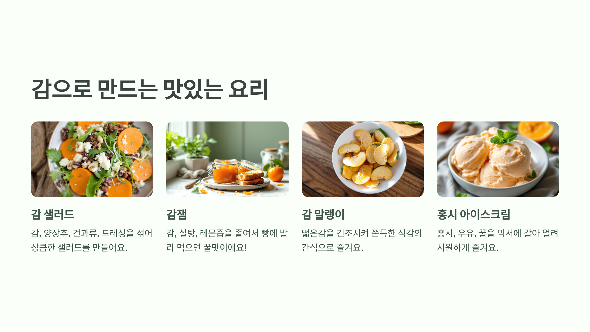 감은 그냥 먹어도 맛있지만, 요리에 활용하면 더 특별한 맛을 낼 수 있어요. 샐러드부터 디저트까지 감을 활용한 다양한 요리법을 소개할게요! 🍊