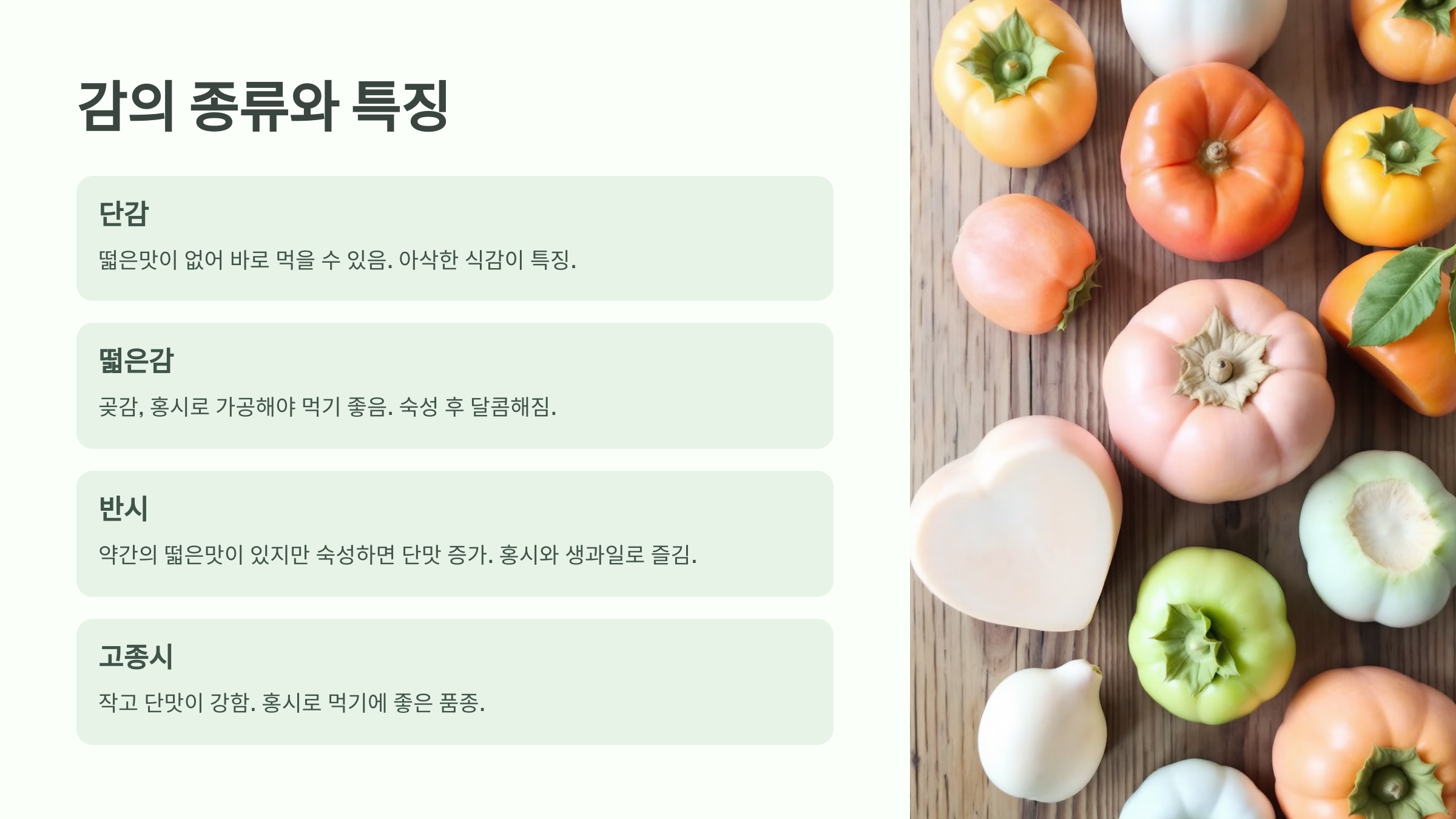 감은 종류에 따라 맛과 식감이 크게 달라요. 대표적으로 단감과 떫은감으로 나뉘며, 각 품종마다 특성이 있어요. 🏡