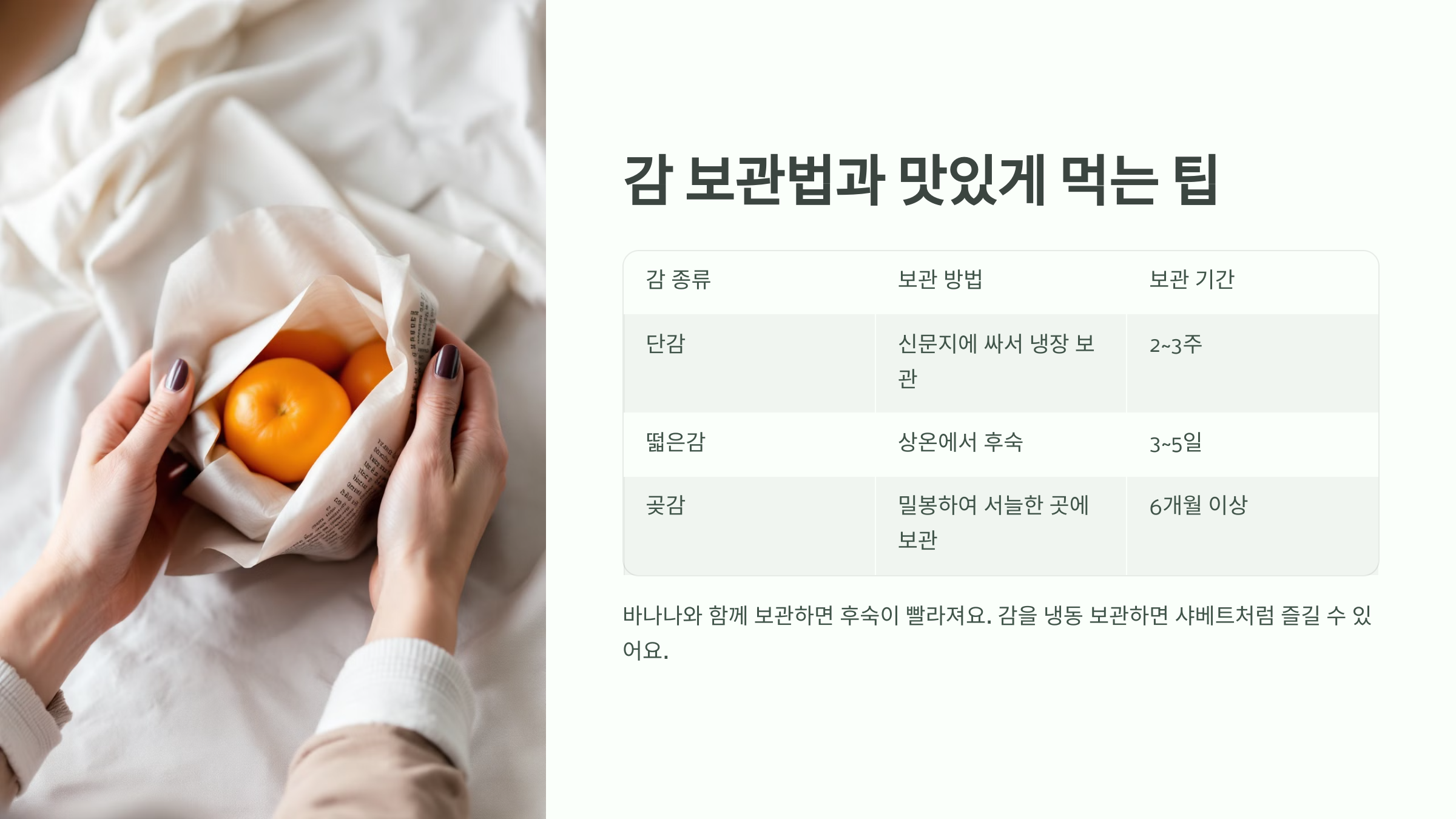 감은 보관 방법에 따라 맛과 식감이 달라져요. 신선하게 오래 보관하는 방법과 감을 더욱 맛있게 먹는 꿀팁을 알려드릴게요! 🍊