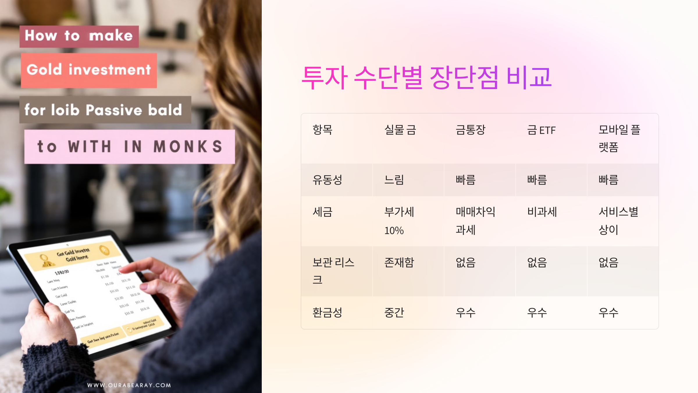 | 실물 금 | 골드바, 금화 직접 보유 | 가시성, 현물 자산 | 보관·도난 위험 |