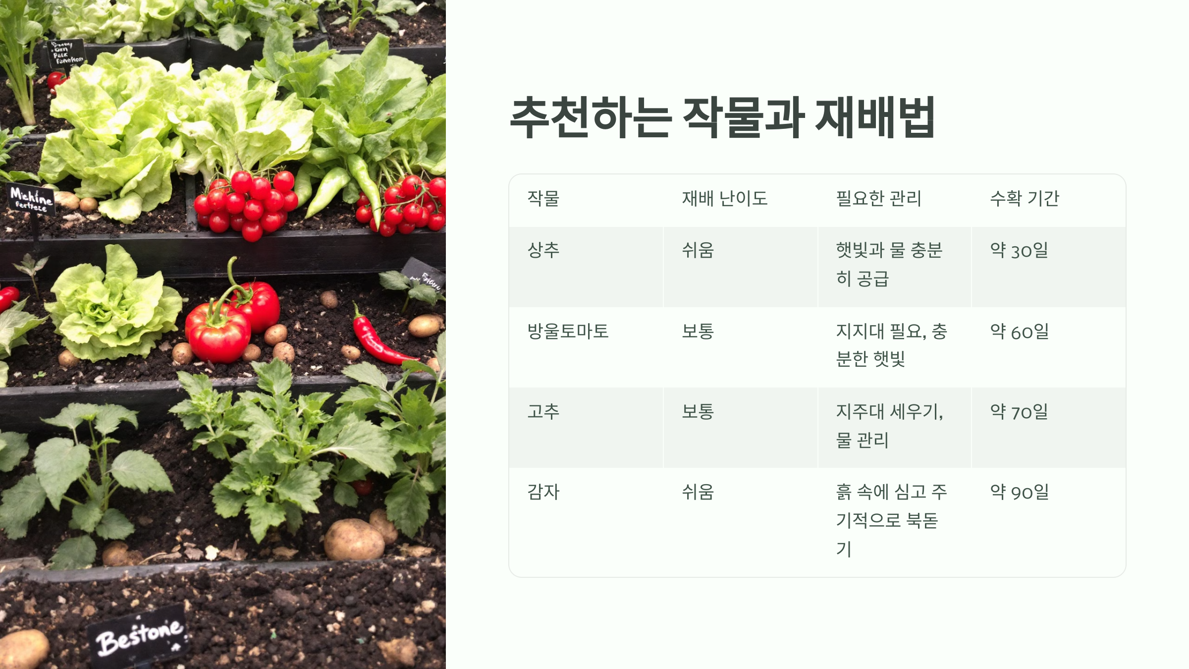 | 작물 | 재배 난이도 | 필요한 관리 | 수확 기간 |