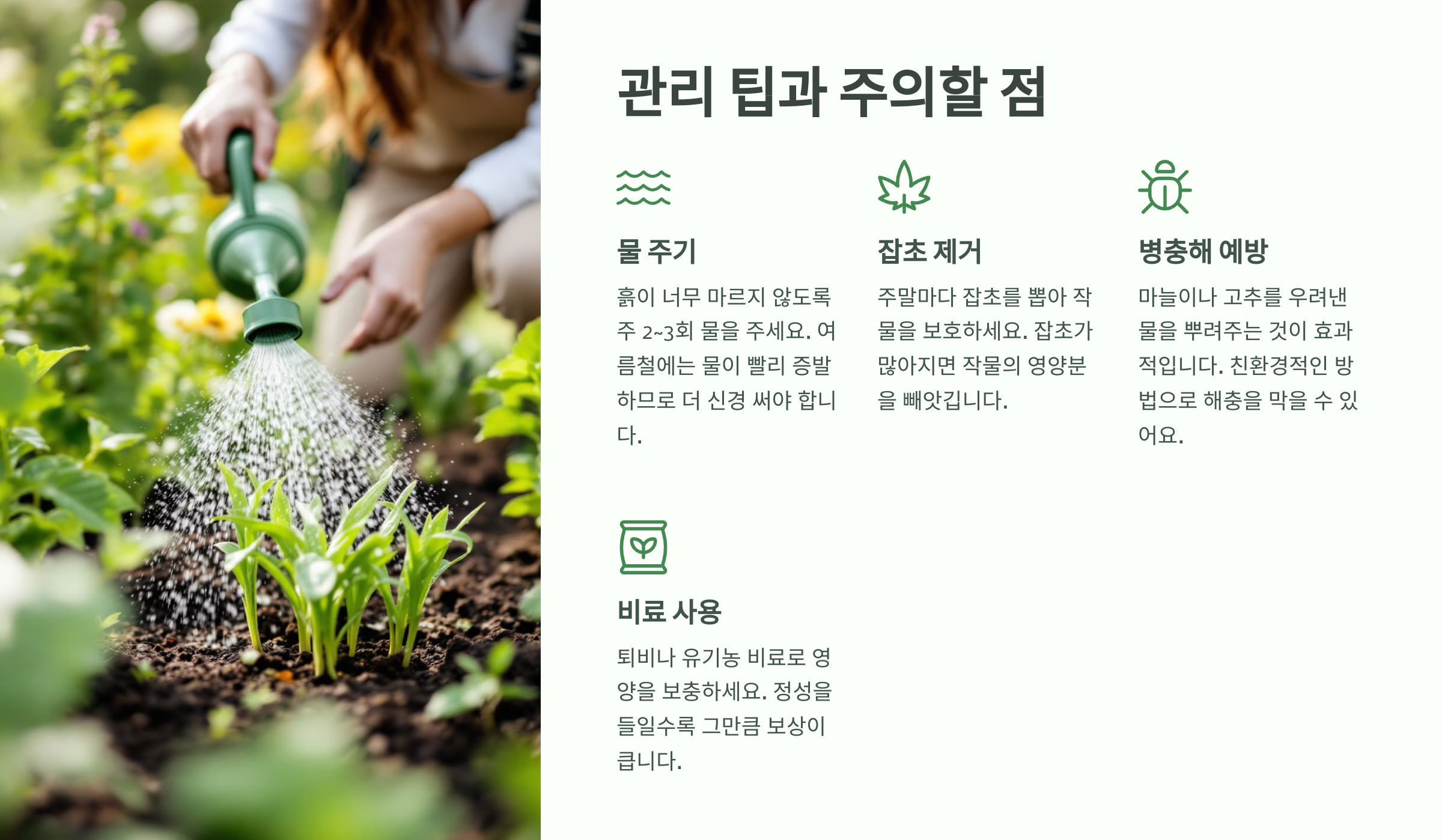 | 병충해 예방 | 천연 방제액(고추·마늘 우린 물) 활용 |