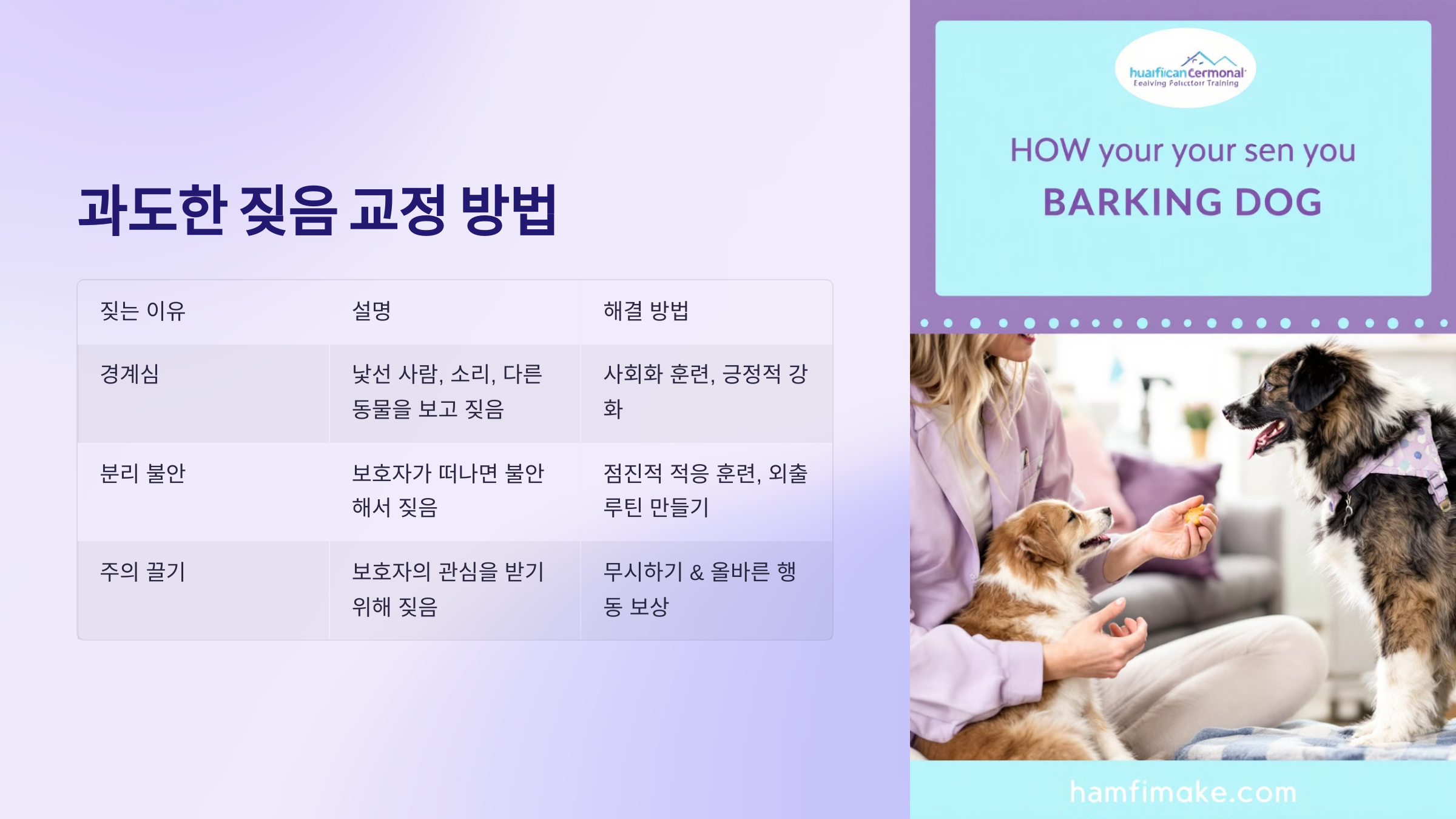 | 분리 불안 | 보호자가 떠나면 불안해서 짖음 | 점진적 적응 훈련, 외출 루틴 만들기 |