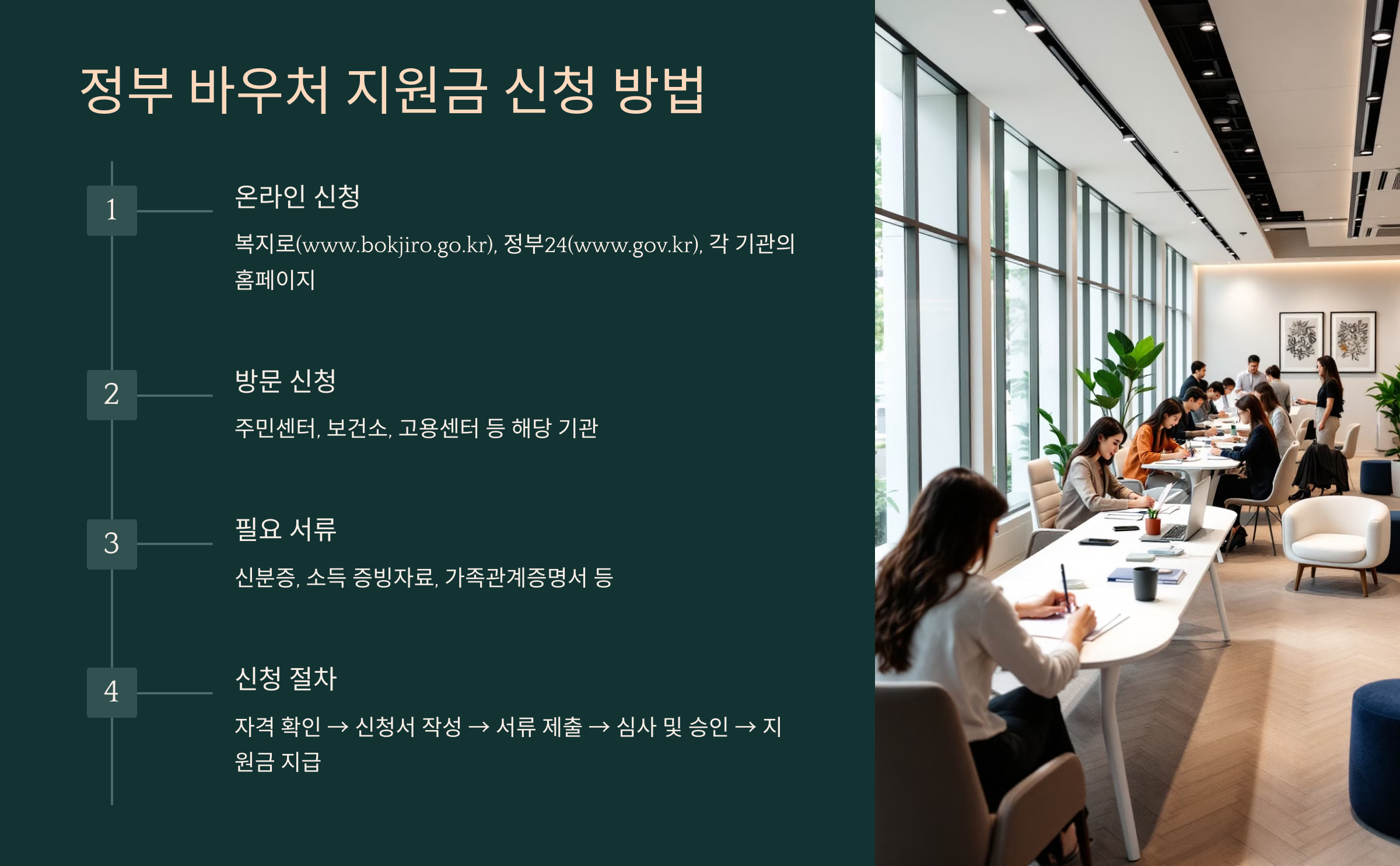 정부 바우처 지원금은 다음과 같은 방법으로 신청할 수 있습니다.