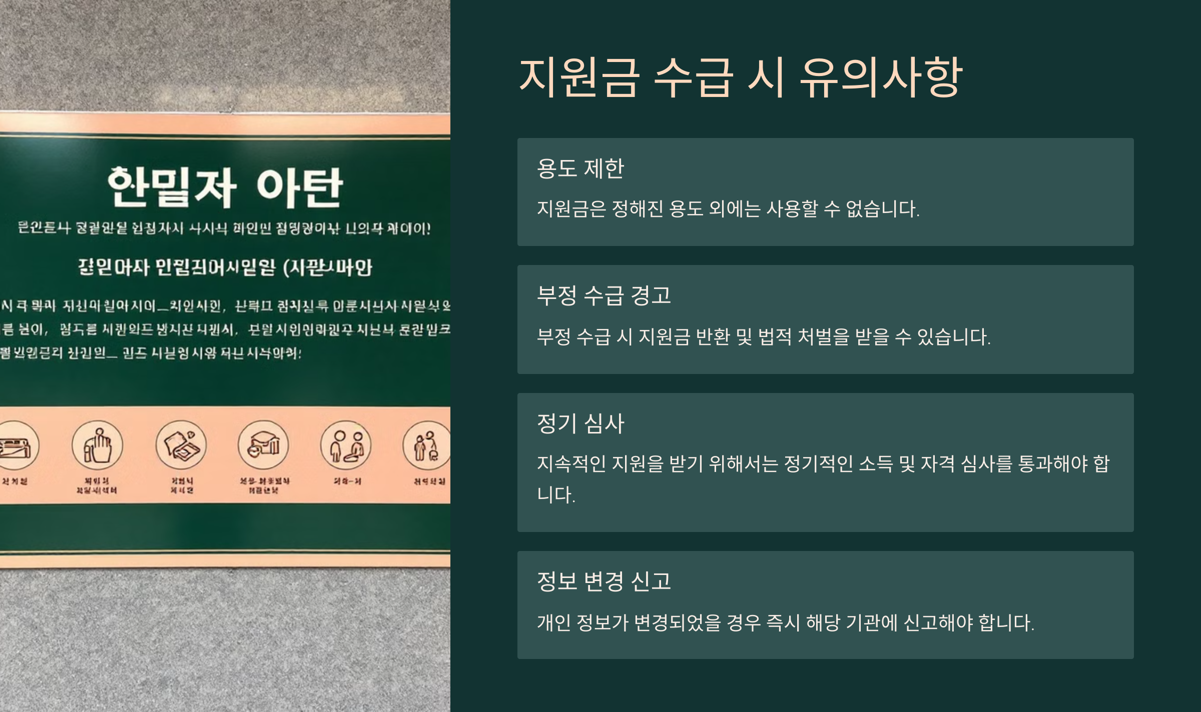 부정 수급 시 지원금 반환 및 법적 처벌을 받을 수 있습니다.