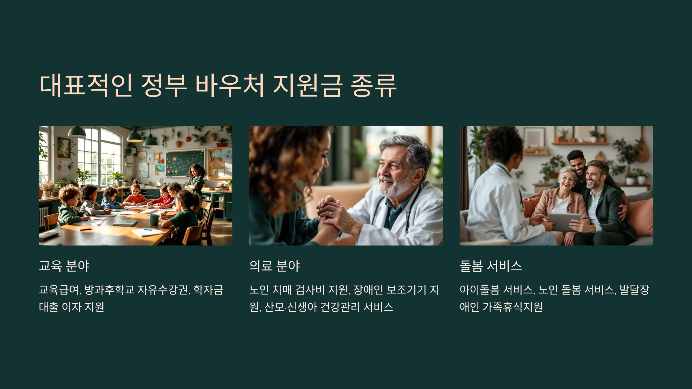 정부는 국민의 삶의 질을 높이고 경제적 부담을 경감하기 위해 다양한 바우처를 제공합니다.