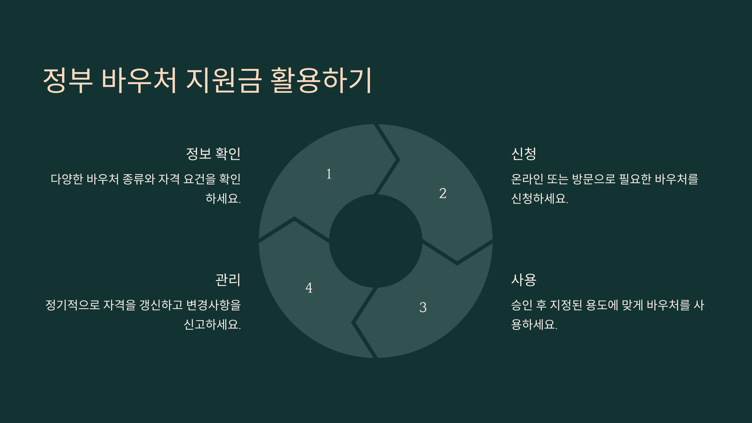 신청 절차: 자격 확인 → 신청서 작성 → 서류 제출 → 심사 및 승인 → 지원금 지급