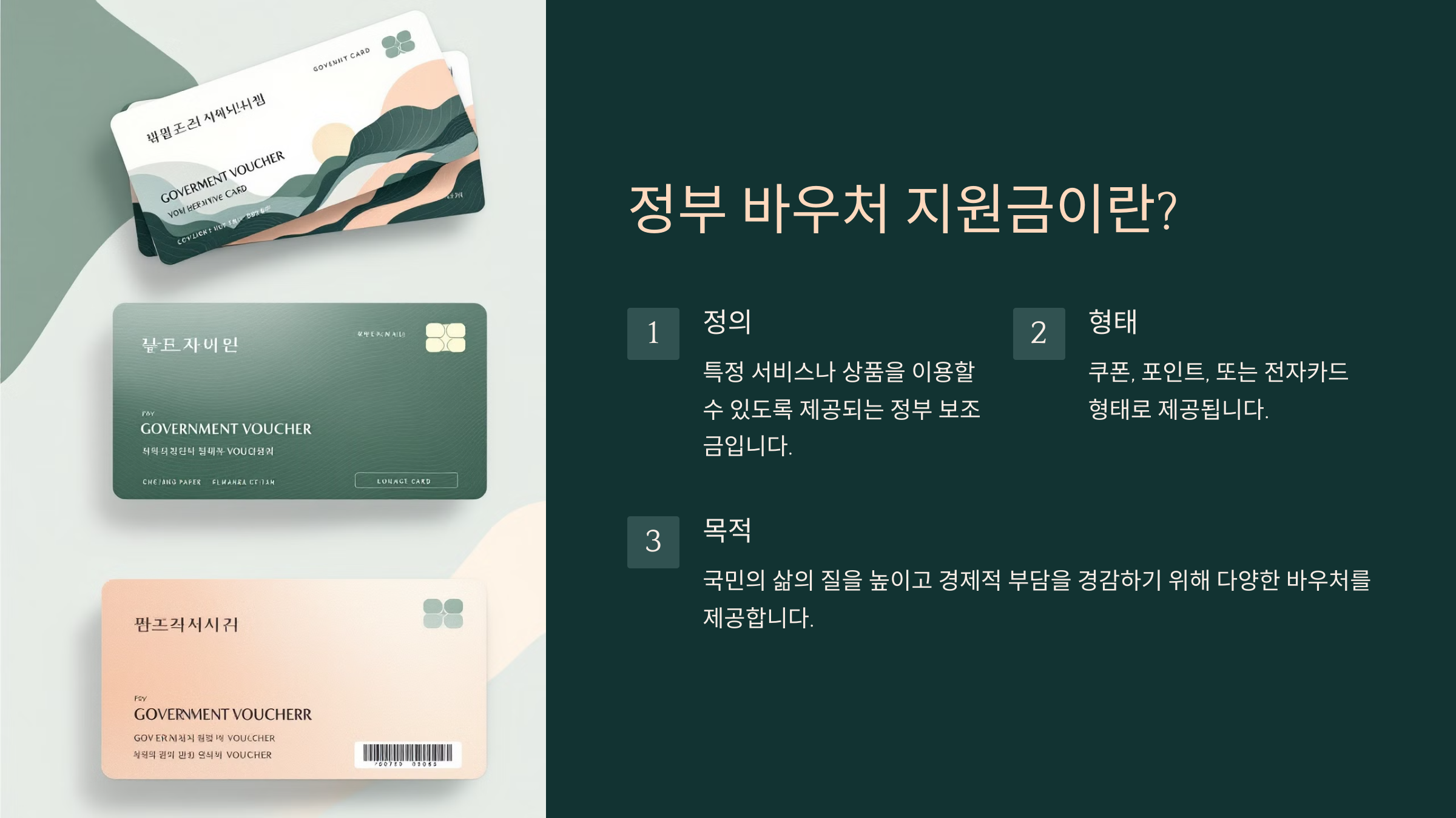 정부 바우처 지원금은 특정 서비스나 상품을 이용할 수 있도록 제공되는 정부 보조금입니다.