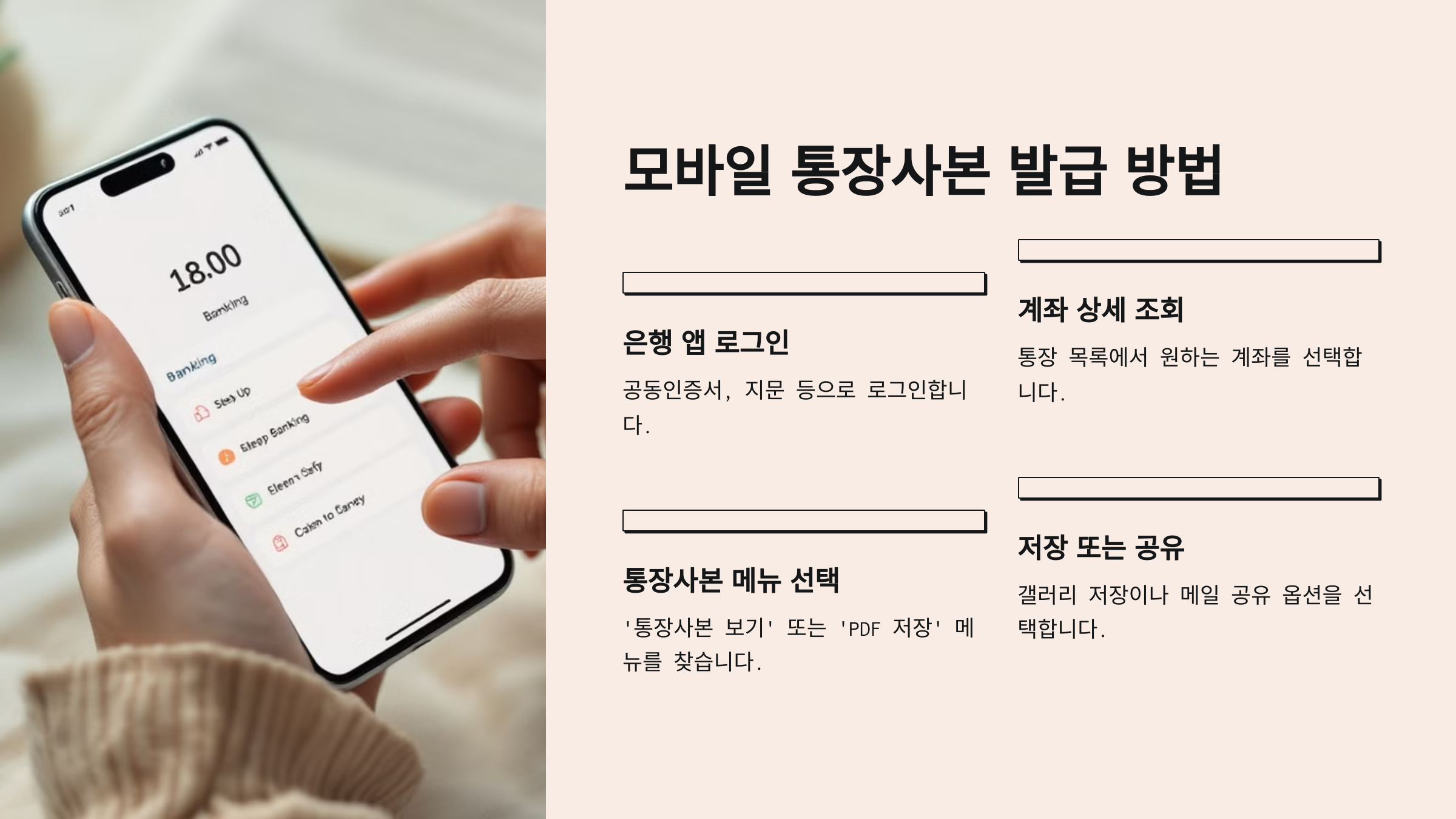 요즘 대부분의 은행 앱에서는 몇 번의 클릭만으로 통장사본을 PDF 또는 이미지로 바로 발급받을 수 있어요. 모바일 인증만 있으면 누구나 쉽게 할 수 있죠.