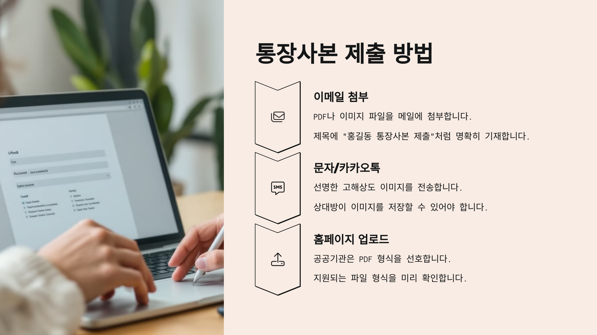 가장 일반적인 방법은 이메일 첨부예요. PDF 파일이나 이미지 파일을 메일에 첨부해서 보내면 돼요. 제목에 "홍길동 통장사본 제출" 같은 식으로 명확히 기재하면 좋아요.