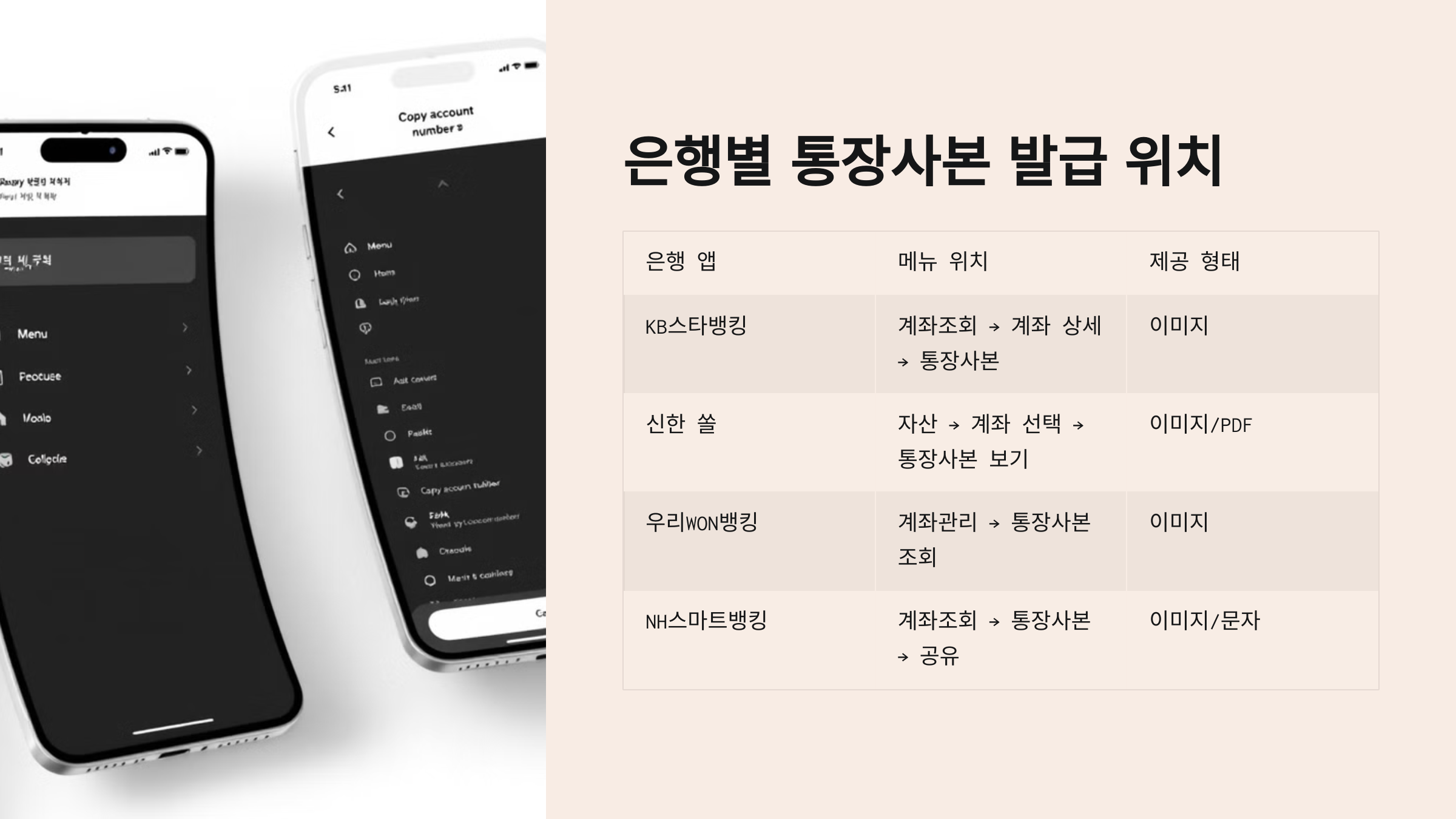 직장 제출용, 정부 지원금 신청, 프리랜서 급여 수령, 각종 계약서류 등에서 자주 쓰이는 통장사본! 오늘은 스마트폰 하나만 있으면 통장사본을 바로 발급하고 저장하는 방법을 알려드릴게요. 은행별 위치까지 다 정리했어요!