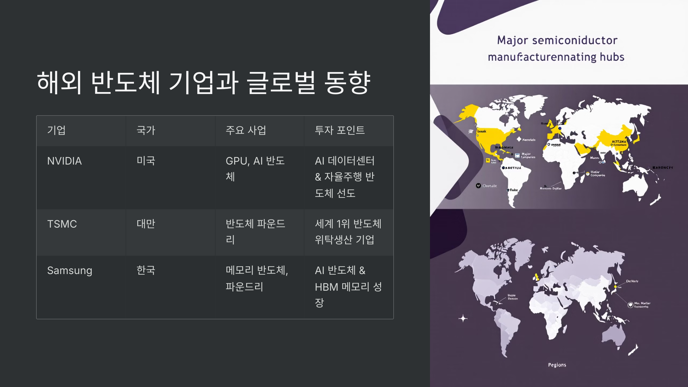 | Samsung (삼성전자) | 한국 | 메모리 반도체, 파운드리 | AI 반도체 & HBM 메모리 성장 |