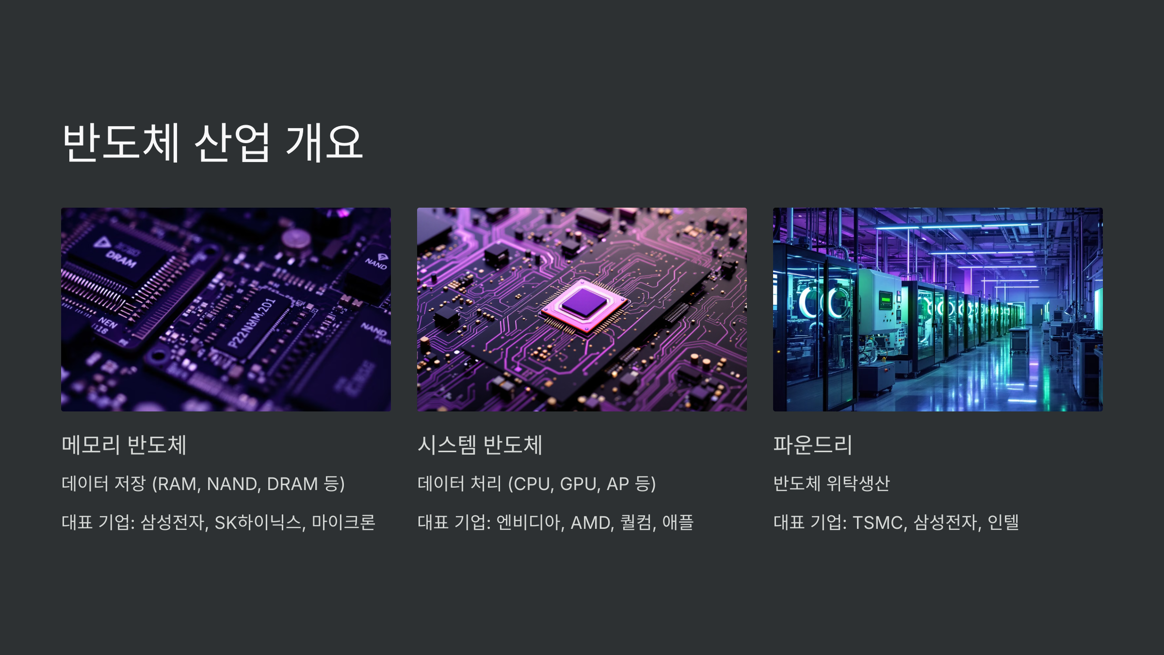 | 💾 메모리 반도체 | 데이터 저장 (RAM, NAND, DRAM 등) | 삼성전자, SK하이닉스, 마이크론 |