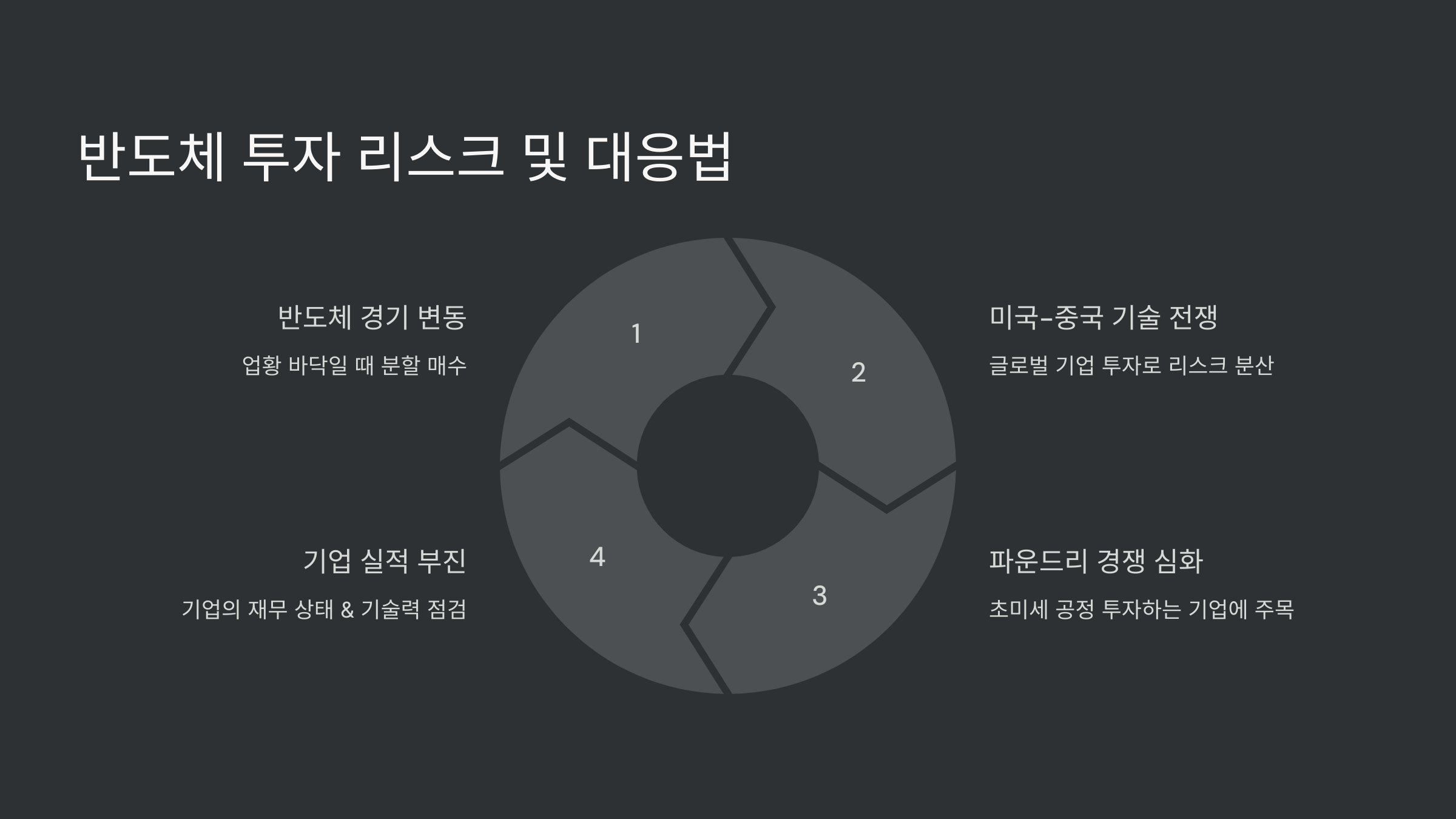 반도체 산업은 경기 변동성이 크기 때문에 철저한 분석과 전략이 필요해요! 그렇다면, 반도체 관련 투자 리스크는 어떤 것들이 있을까요? 🤔