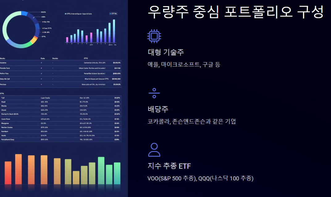 • 장기 투자: 배당주와 대형 우량주에 투자하여 안정적인 성장을 추구합니다.
