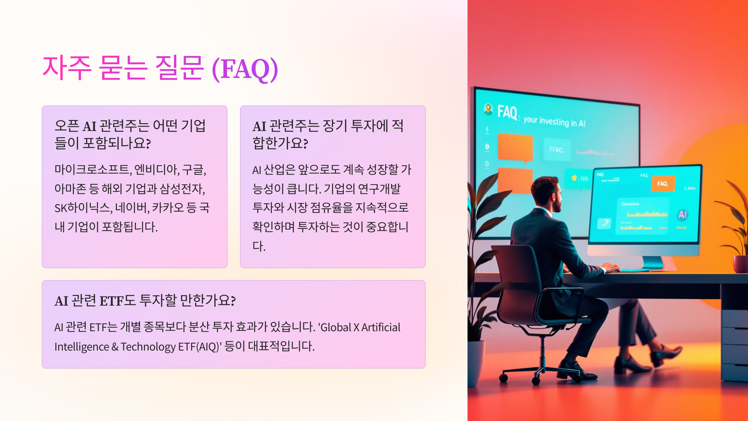 A8. AI 관련주는 장기적인 성장 가능성이 있지만, 단기적으로 변동성이 클 수 있어요. 기업의 실적 발표 시점이나 AI 기술 발표 이후 주가 조정을 받을 때를 노려볼 수 있어요.