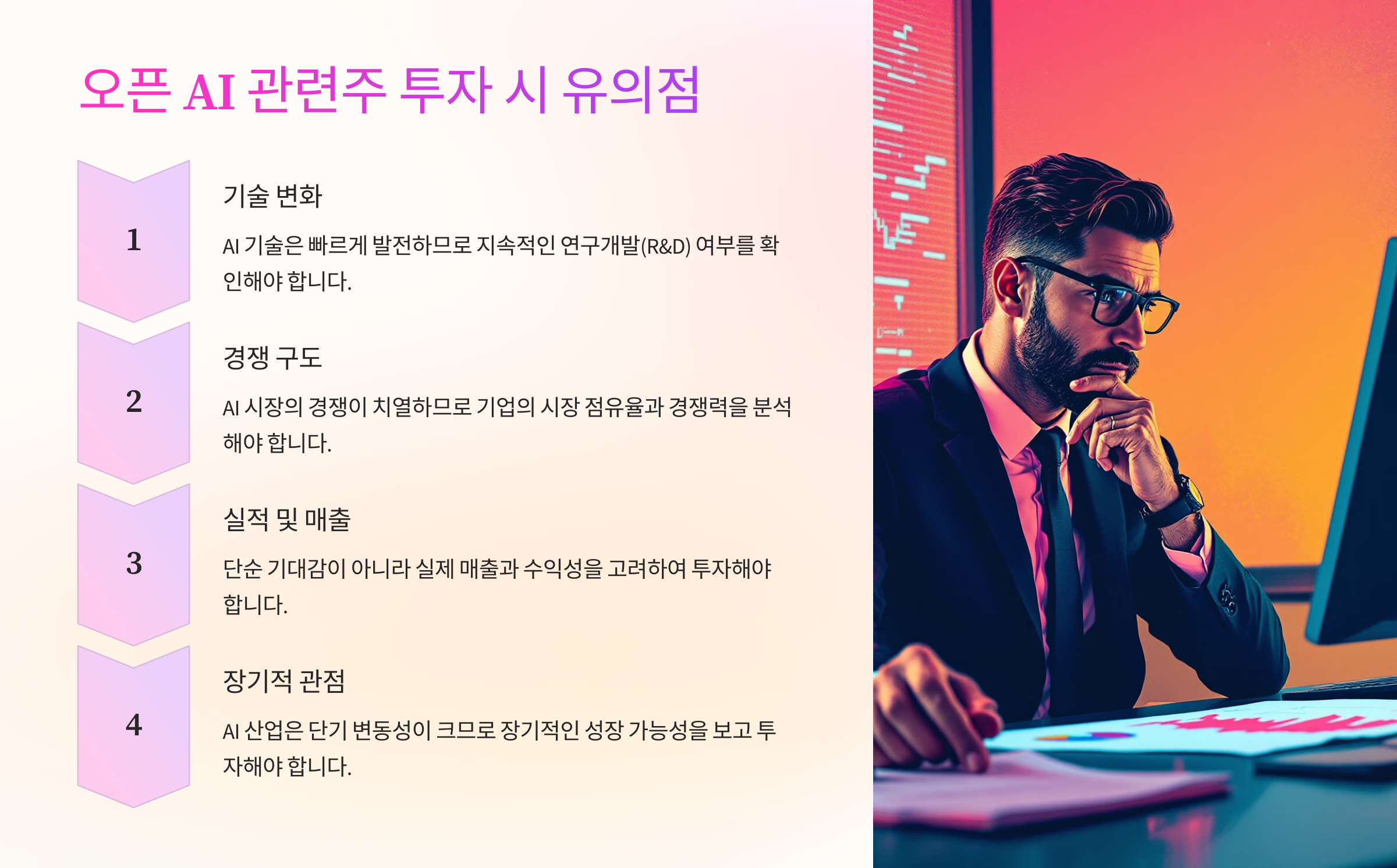 오픈 AI 관련주는 AI 산업의 성장과 함께 주목받고 있지만, 모든 투자가 그렇듯이 신중한 접근이 필요해요. AI 기술의 발전 속도, 기업의 경쟁력, 시장 환경 등을 고려해야 해요.