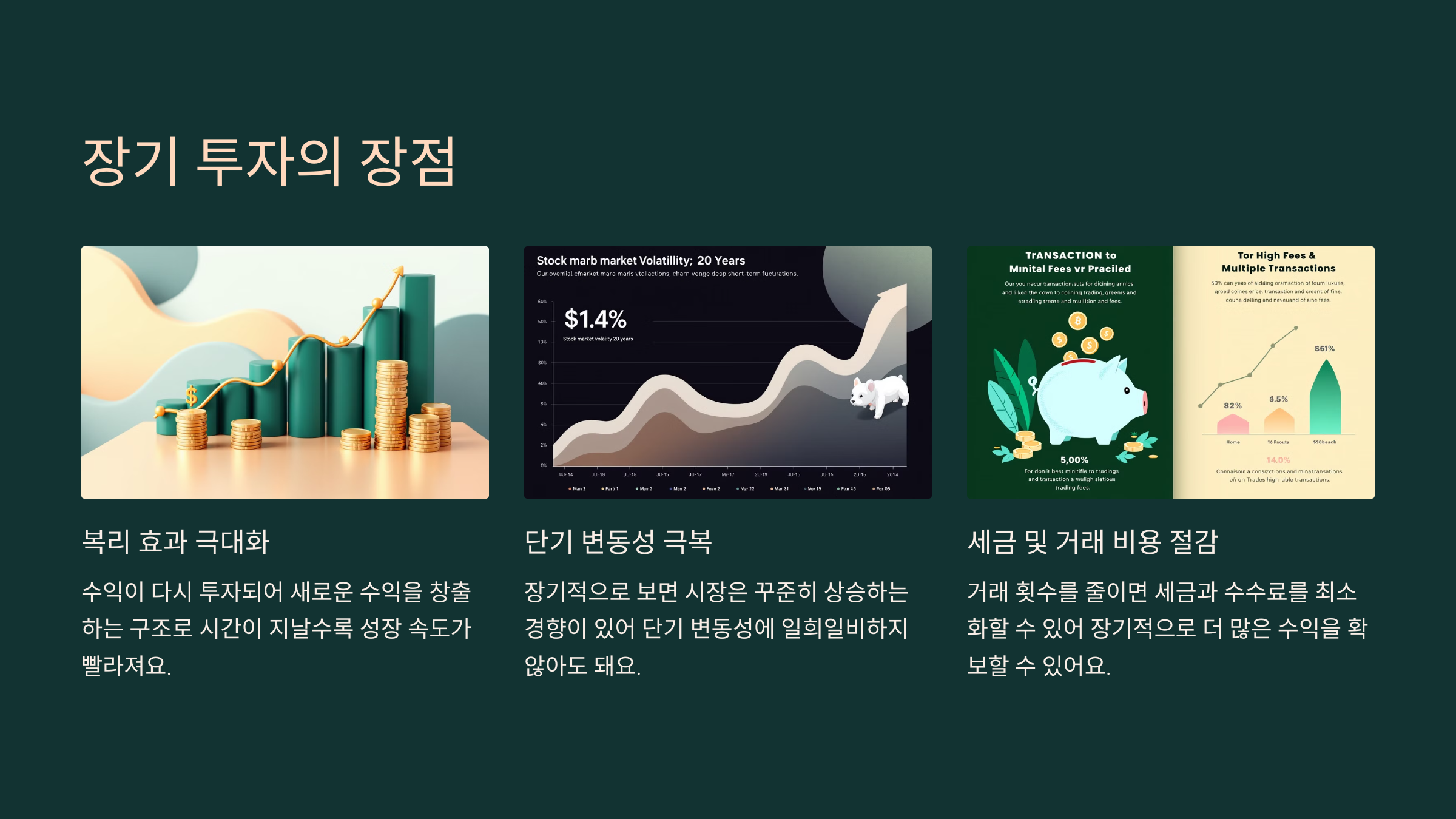 💰 **세금 및 거래 비용 절감** 단기 투자는 잦은 매매로 인해 세금과 수수료가 발생하지만, 장기 투자는 이러한 비용을 최소화할 수 있어요. 거래 횟수를 줄이면 장기적으로 더 많은 수익을 확보할 수 있죠.