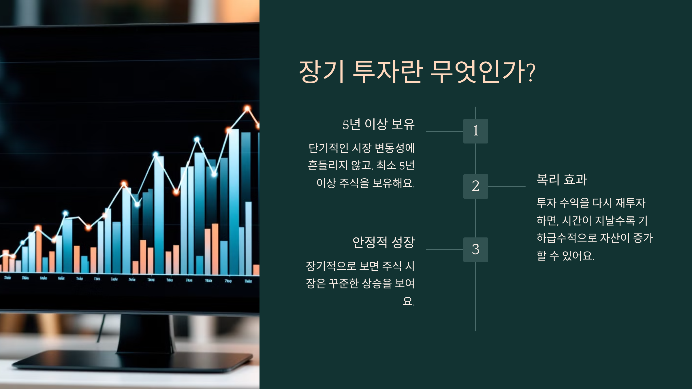 장기 투자는 단기적인 시장 변동성에 흔들리지 않고, 최소 **5년 이상** 주식을 보유하며 기업의 성장과 함께 자산을 키워나가는 투자 방식이에요. 📈