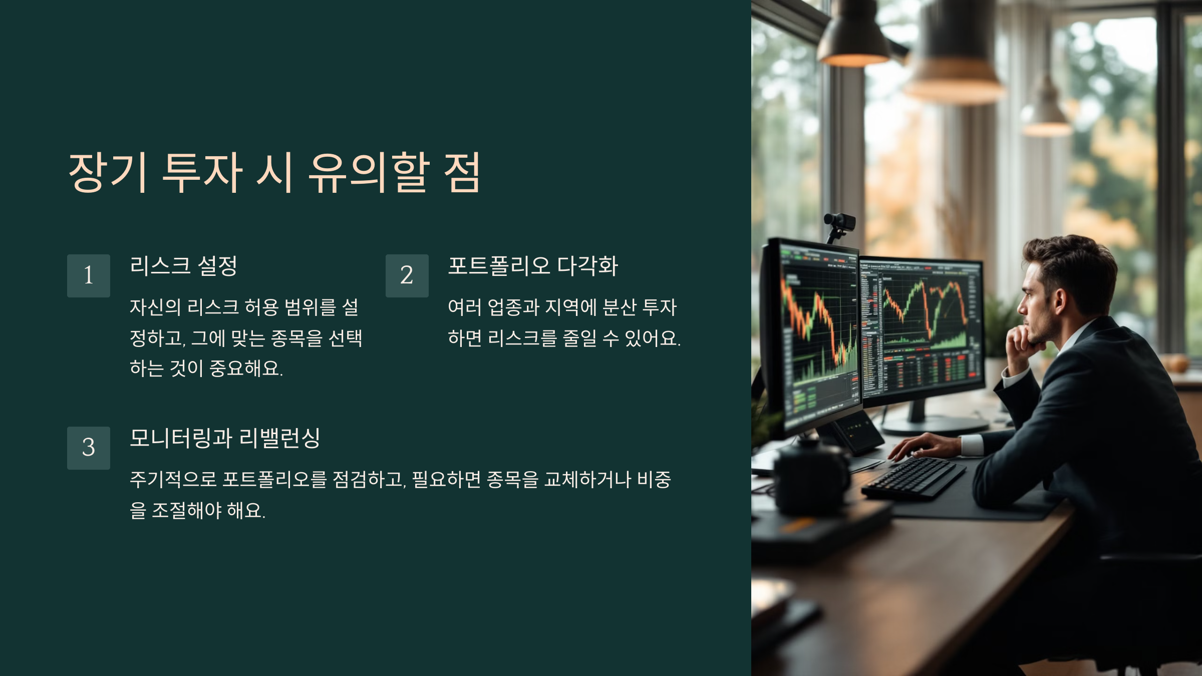 장기 투자는 안정적인 투자 방법이지만, 몇 가지 유의해야 할 점이 있어요. 투자 기간이 길어질수록 시장 변화에 대응하는 전략이 필요하답니다.