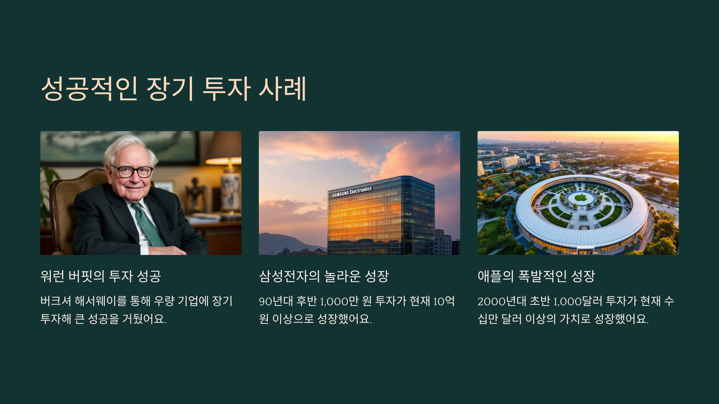 **📌 삼성전자 장기 투자 사례** 삼성전자는 국내에서도 가장 성공적인 장기 투자 사례 중 하나예요. 1990년대 후반 삼성전자 주식을 1,000만 원어치 매수했다면, 지금은 10억 원 이상의 가치로 성장했어요. 삼성전자는 반도체, 스마트폰 등 글로벌 시장에서 강력한 경쟁력을 보유하고 있어요.