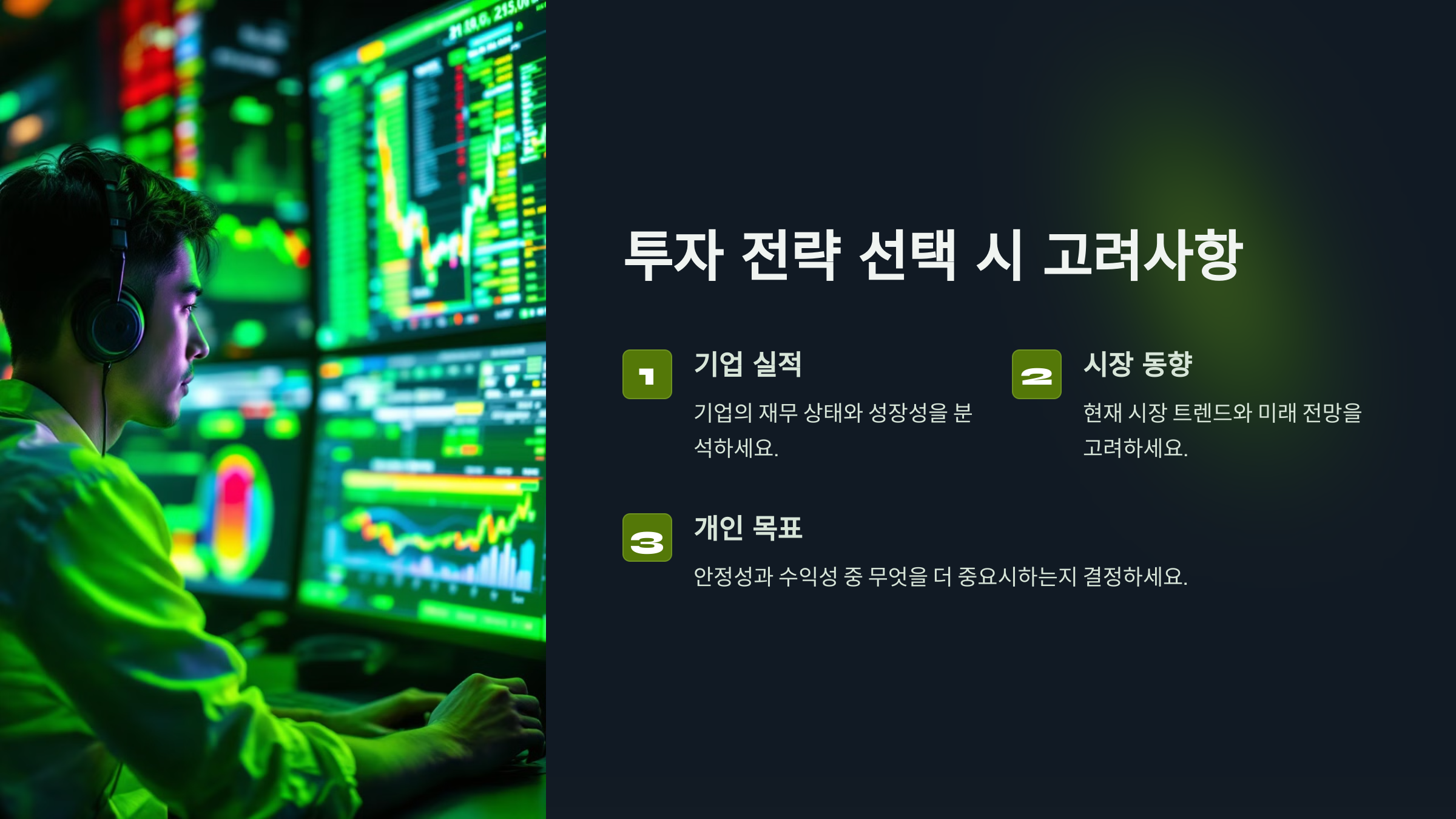 효율적인 투자 전략을 위해서는 먼저 자신의 투자 성향을 파악하는 것이 중요해요. 안정적인 현금흐름을 원하면 배당주 투자가 적합하고, 높은 수익을 추구한다면 시세차익 전략을 고려해야 해요.