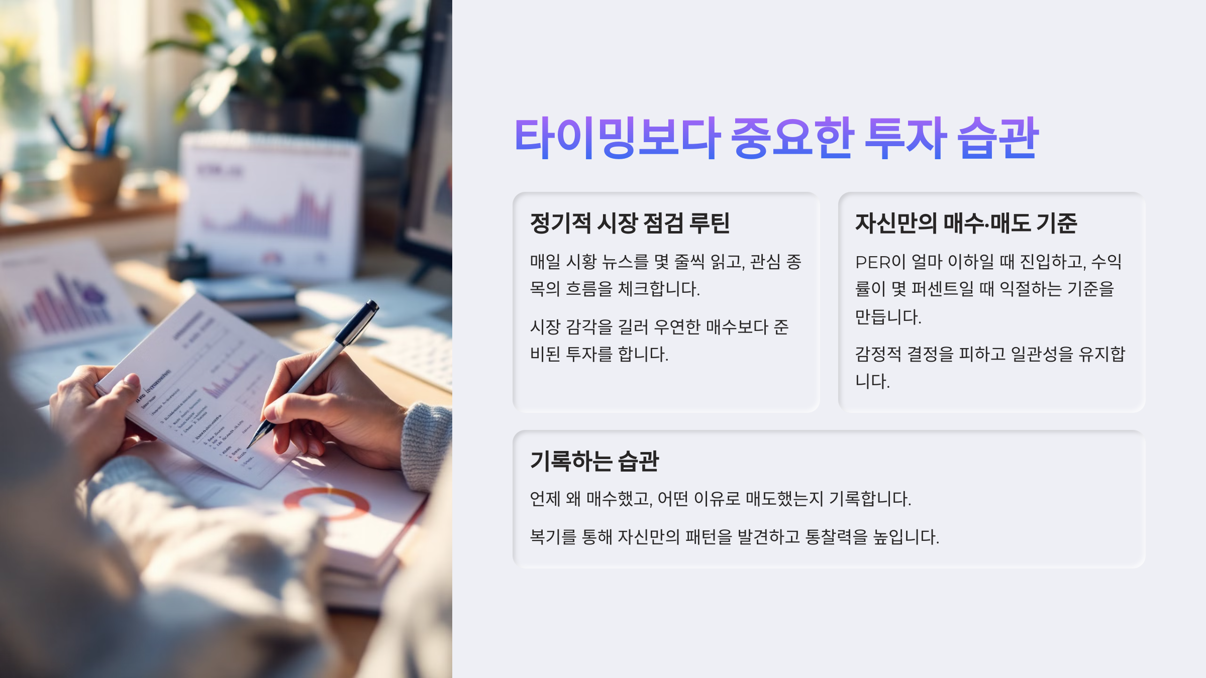 첫 번째 습관은 **정기적으로 시장을 점검하는 루틴**이에요. 매일 시황 뉴스를 몇 줄씩 읽고, 관심 종목의 흐름을 체크하는 것만으로도 시장 감각이 길러져요. 아무 준비 없이 우연히 매수하는 사람보다, 시장을 익히며 투자하는 사람이 훨씬 성공 확률이 높아요.