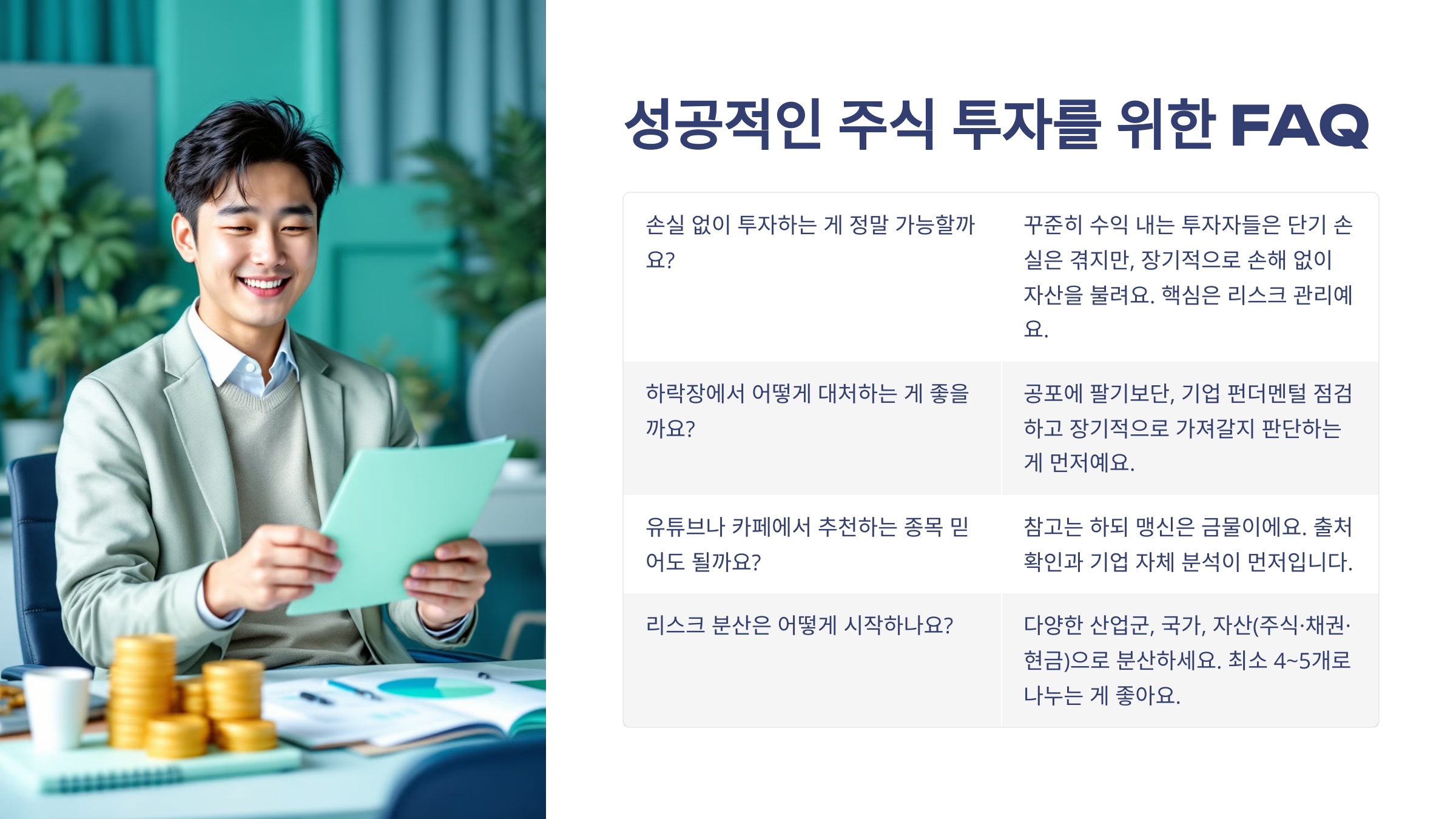 A8. 다양한 산업군, 국가, 자산(주식·채권·현금)으로 분산하세요. 최소 4~5개로 나누는 게 좋아요.