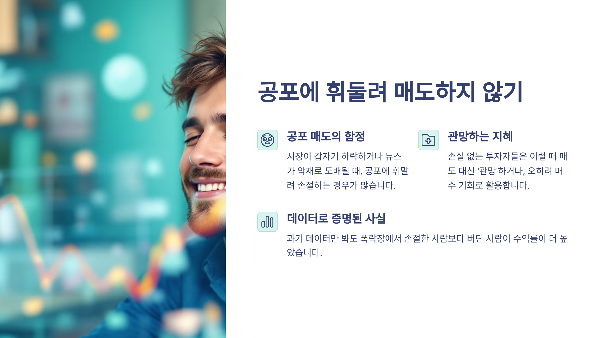 심지어 공포 매도 후 다시 오를 때는 더 비싼 값에 재매수하는 경우가 많아 손실이 두 배가 되기도 해요. 감정은 시장보다 빨리 반응하기 때문에, 반사적으로 움직이면 안 돼요.