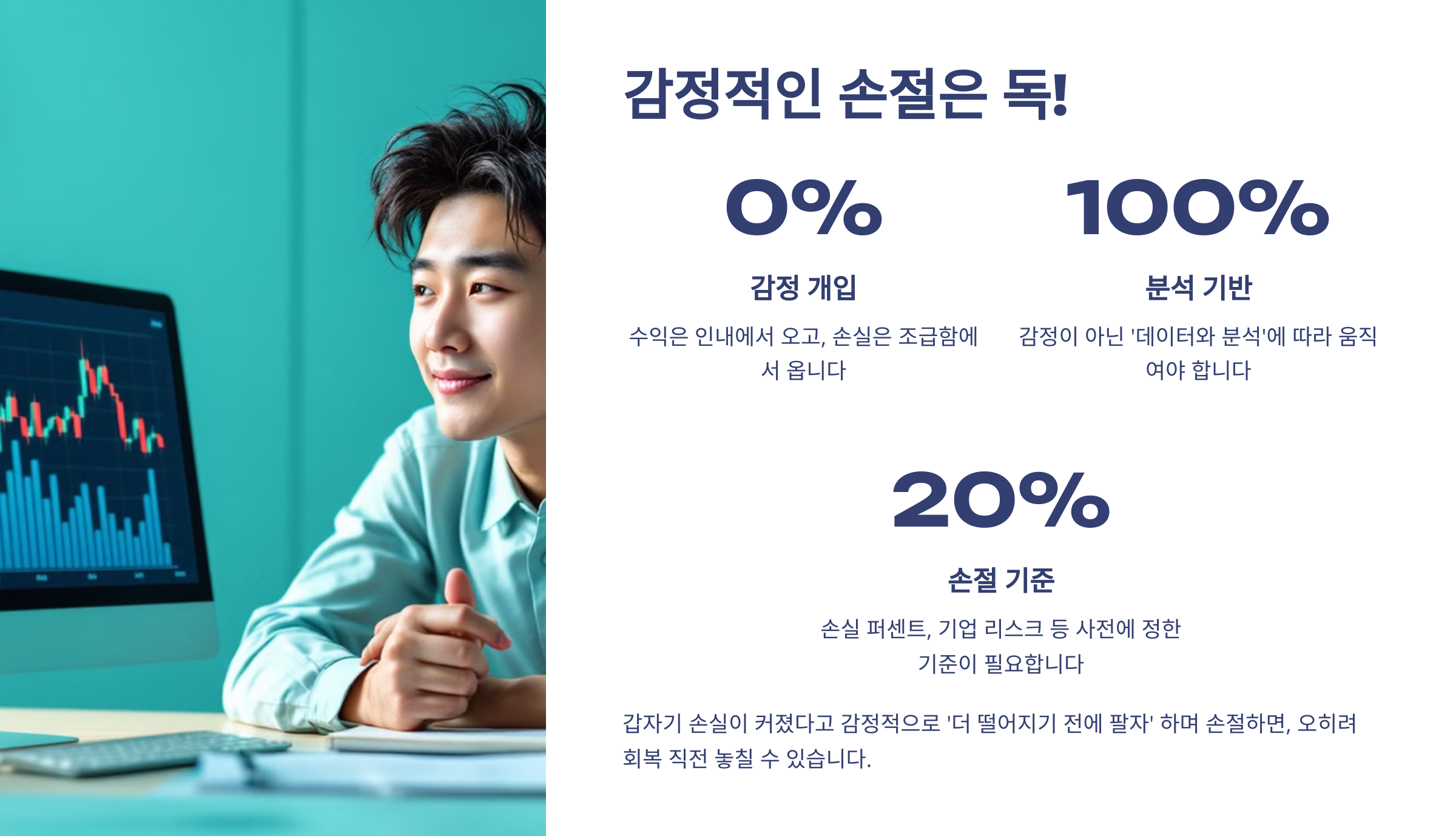 손절은 필요하지만, 기준이 있어야 해요. 손실 퍼센트, 기업 리스크, 매도 타이밍 등 사전에 정한 기준 없이 감정에 따라 움직이면 절대 수익 내기 어려워요.