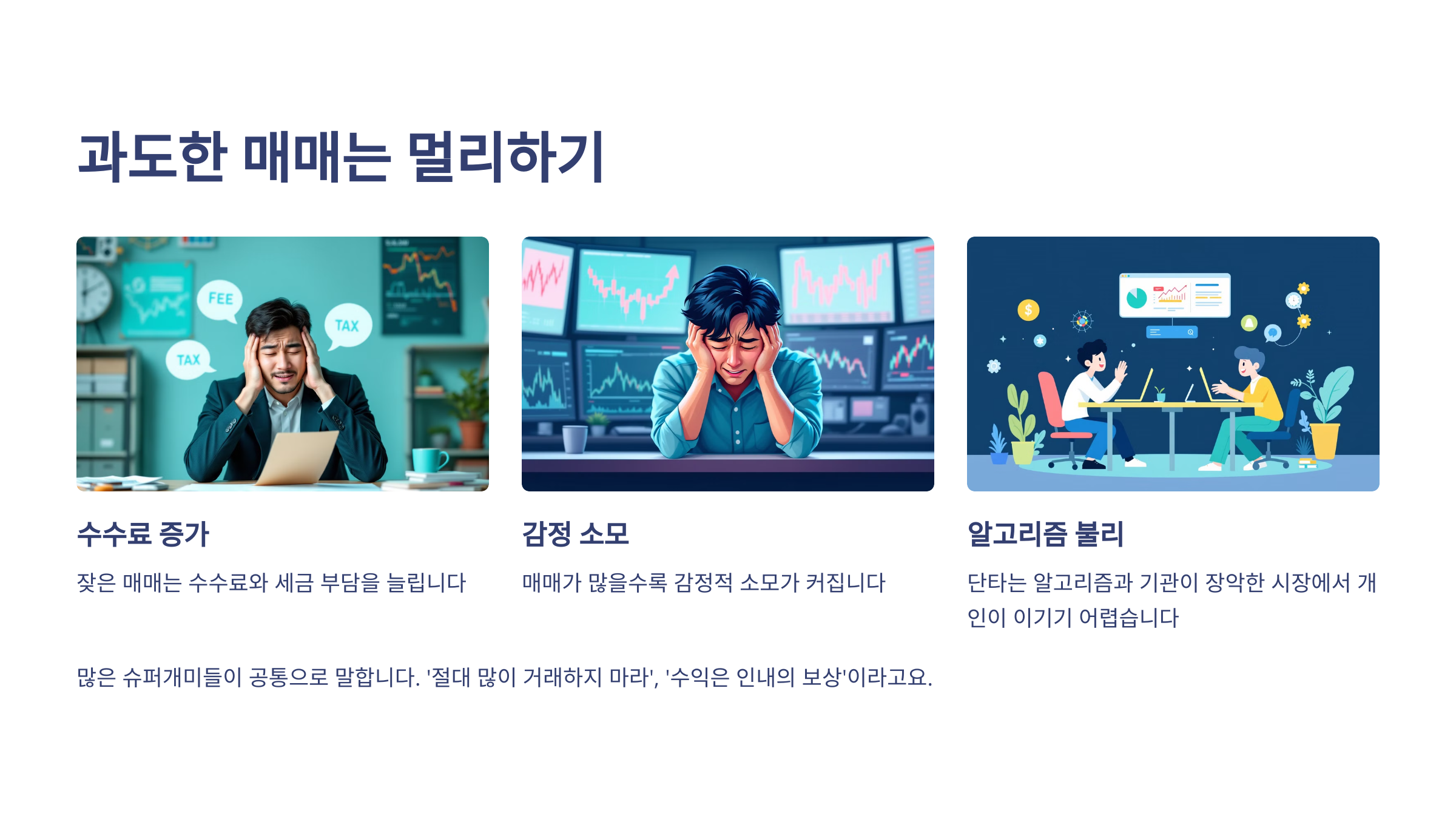 많은 슈퍼개미들이 공통으로 말해요. ‘절대 많이 거래하지 마라’, ‘수익은 인내의 보상’이라고요. 주식은 심리 게임인 만큼, 지나친 매매는 결국 자산을 깎아먹는 행동이 돼요.