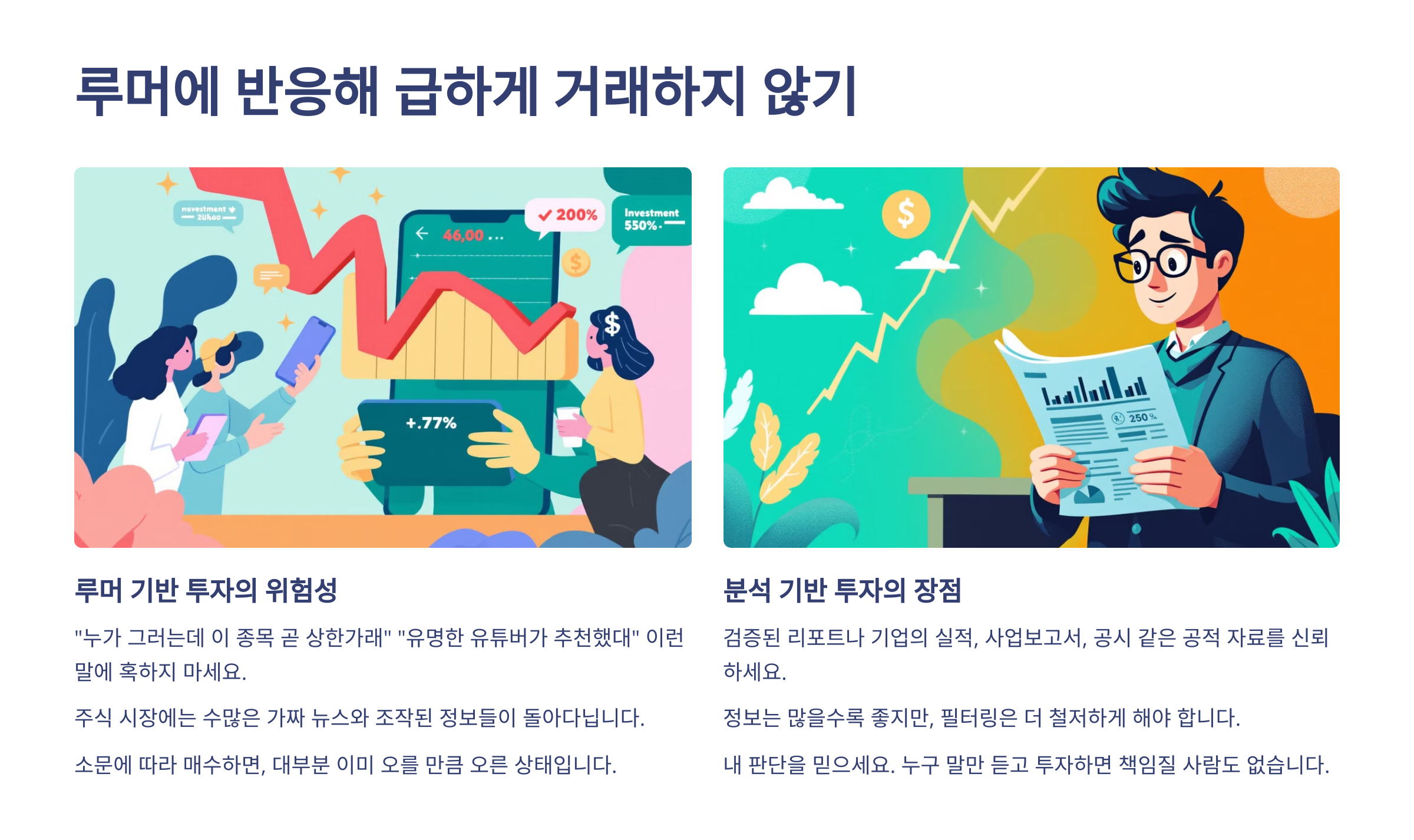 주식 시장에는 수많은 가짜 뉴스와 조작된 정보들이 돌아다녀요. 소문에 따라 매수하면, 대부분 이미 오를 만큼 오른 상태고, 실적도 없는 경우가 많아요. 반짝 상승 뒤 하락하는 ‘묻지마 매수’가 되기 쉬워요.