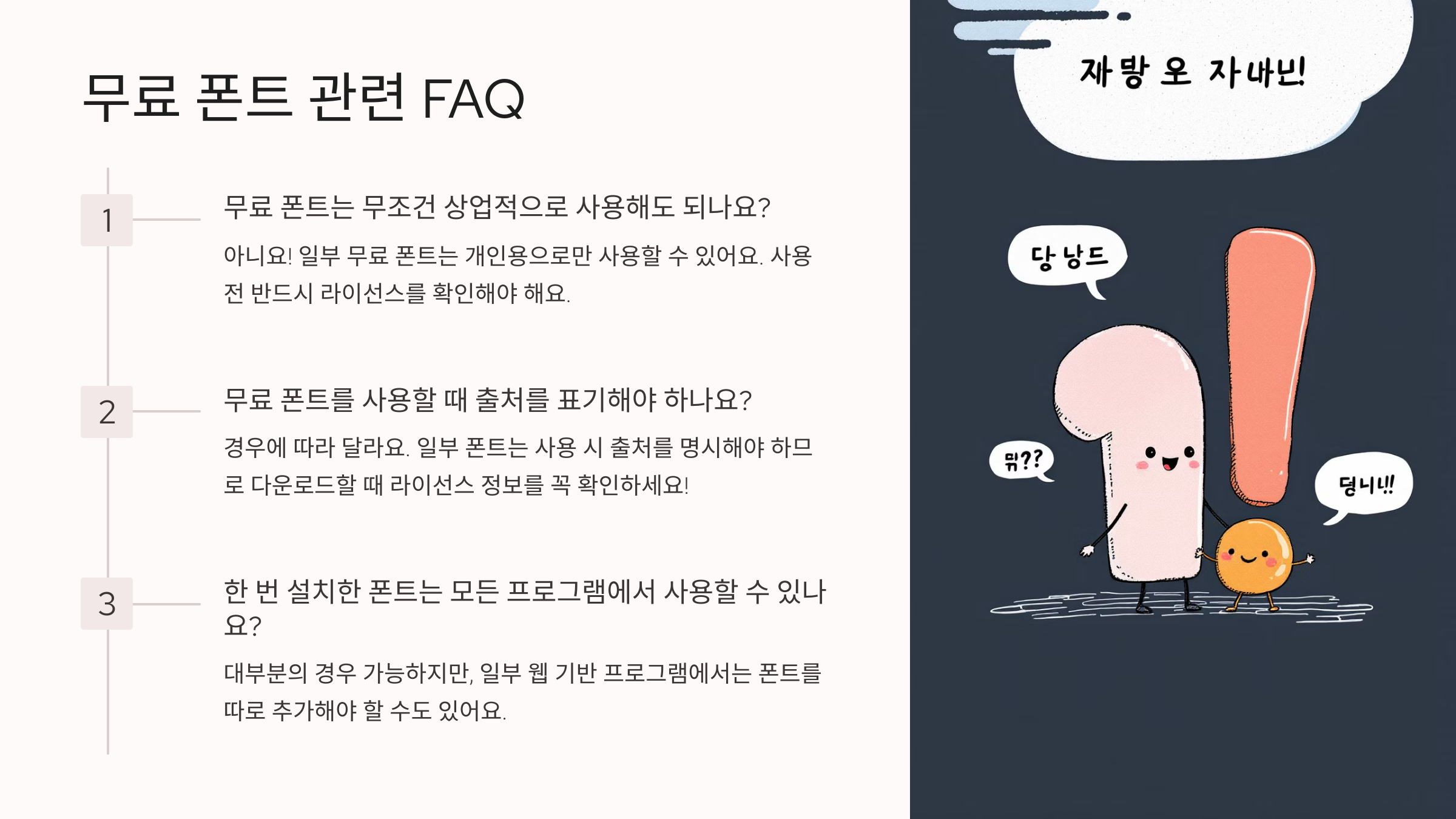 A2. 경우에 따라 달라요. 일부 폰트는 사용 시 출처를 명시해야 하므로 다운로드할 때 라이선스 정보를 꼭 확인하세요! 📜