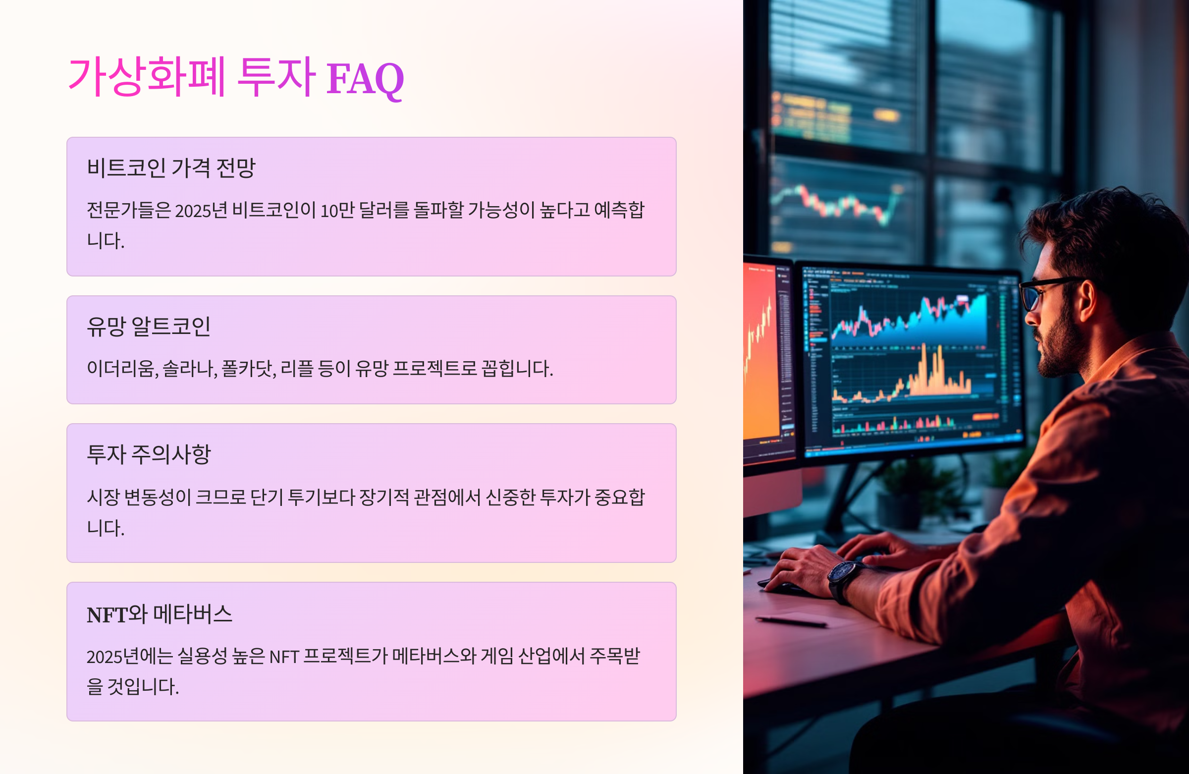 A7. NFT 시장은 다소 조정을 겪었지만, 메타버스와 게임 산업에서 지속적으로 활용될 가능성이 커요. 2025년에는 실용성 높은 NFT 프로젝트가 주목받을 거예요.